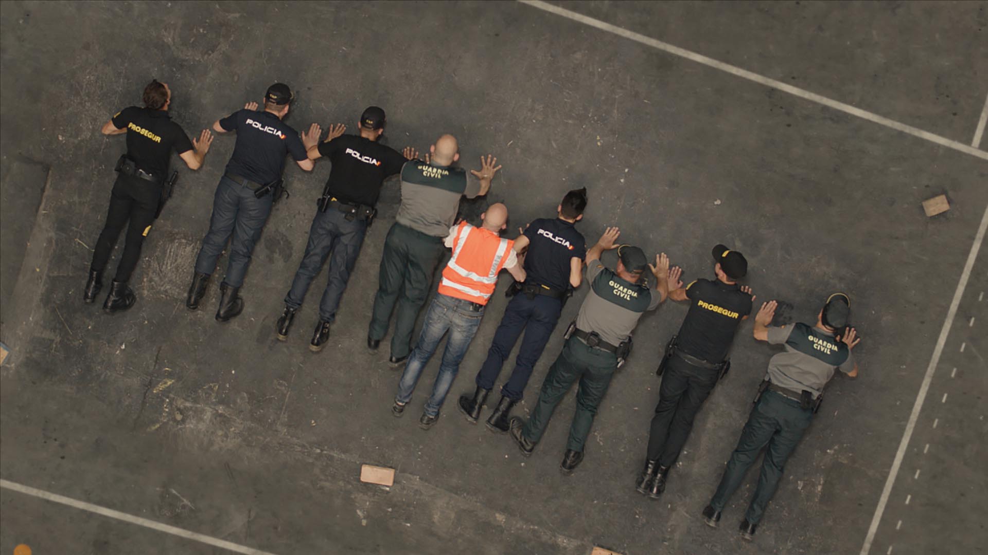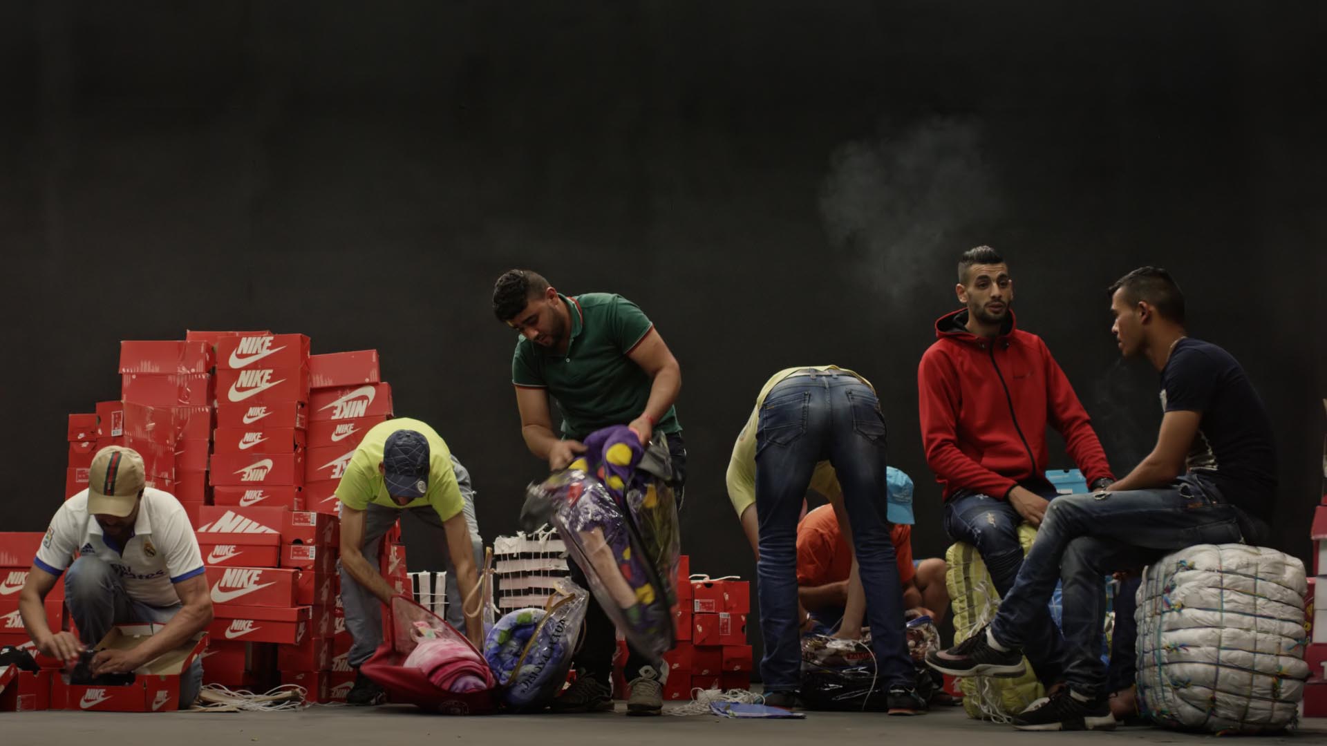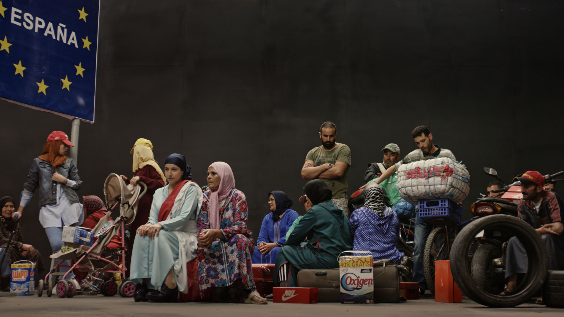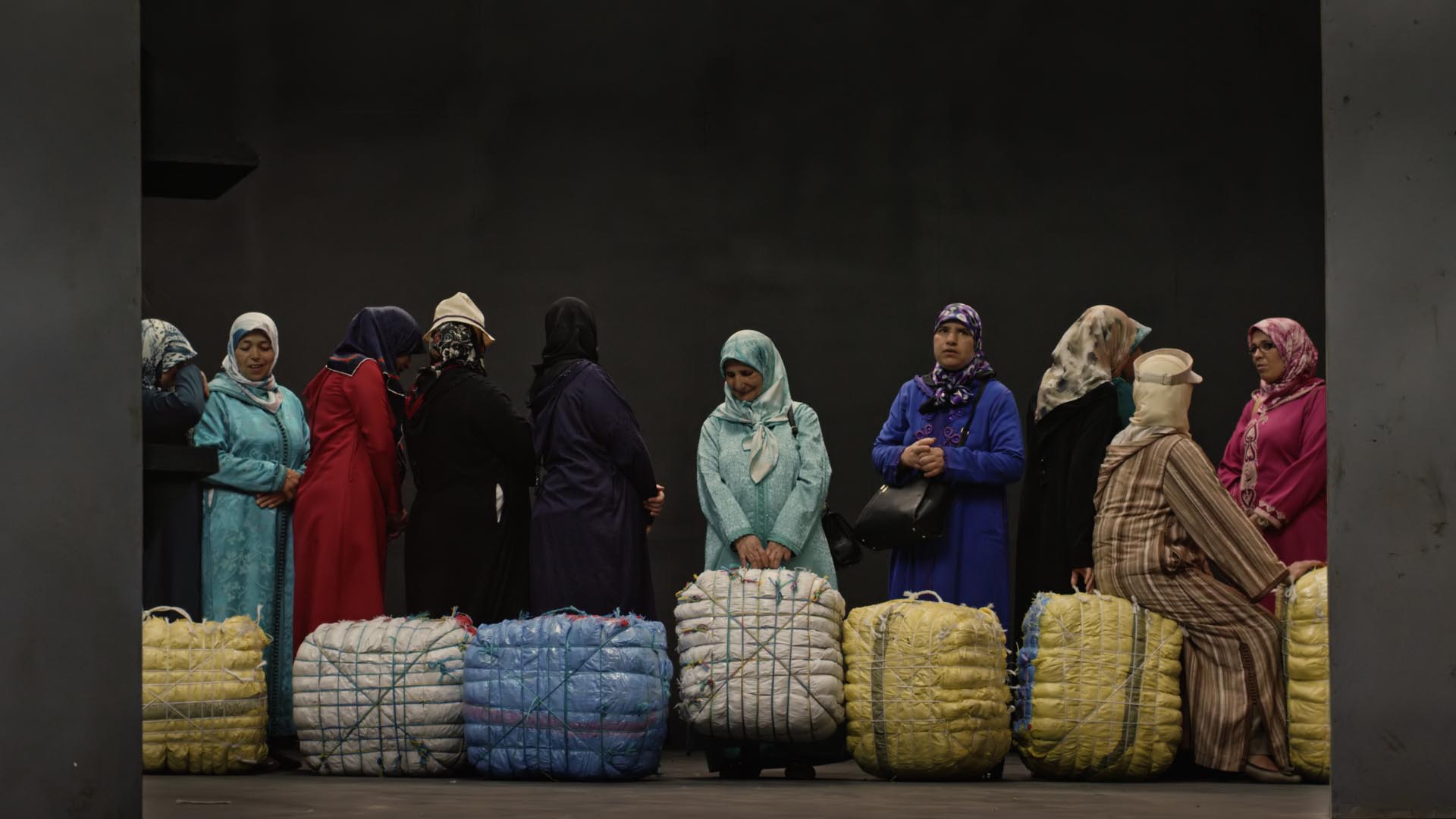 Bab Sebta (Ceuta’s gate) consists of a series of reconstructed situations based on observations made on the border of Ceuta, a Spanish enclave on Moroccan soil, providing the scene for an intense trafficking of manufactured goods, sold at discounted prices. Every day, thousands of people work there. The film portrays this “doorway to Europe,” a place where a murky economy of semi-legal exchanges takes place across a border anomaly. The border is represented by painted lines across the tarmac. Across these surfaces, Maroufi choreographs a slow ritualistic ballet of gestures and rites, shot from above. The camera pans across the infinite lines of people waiting with bundles and parcels containing food, appliances, clothes, and various other goods, all of which will pass through checkpoints, in a back and forth between smugglers and border control officers.