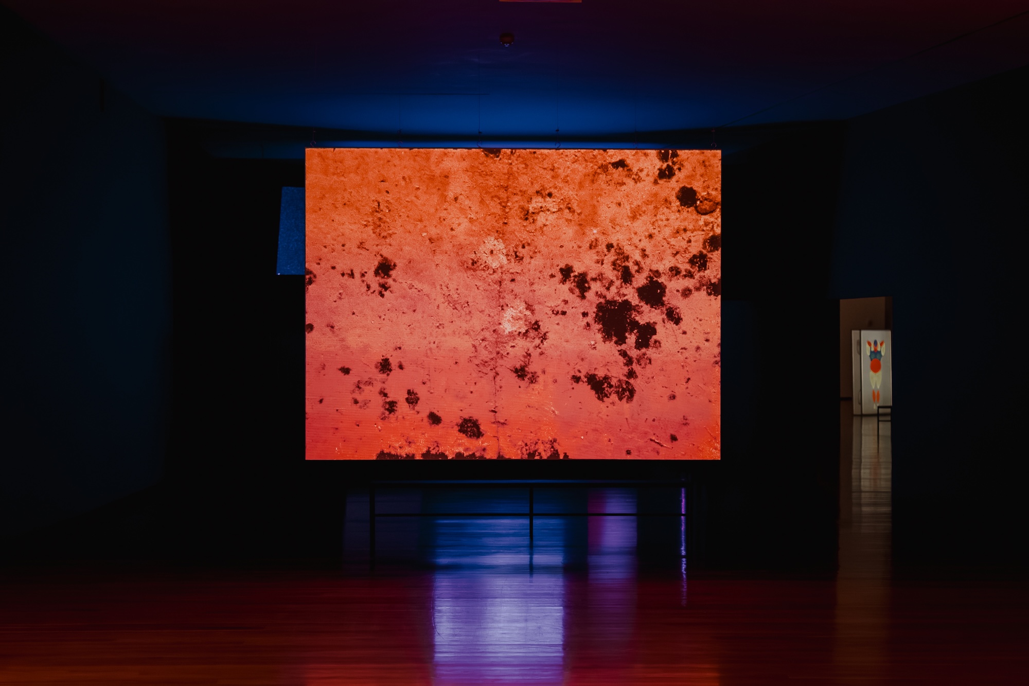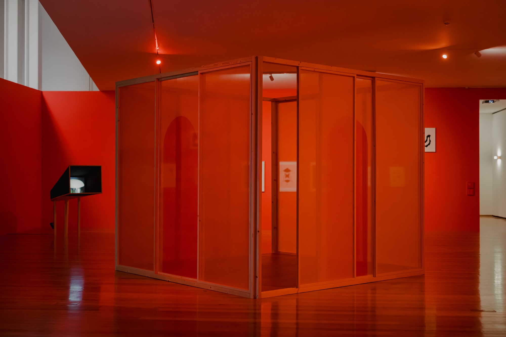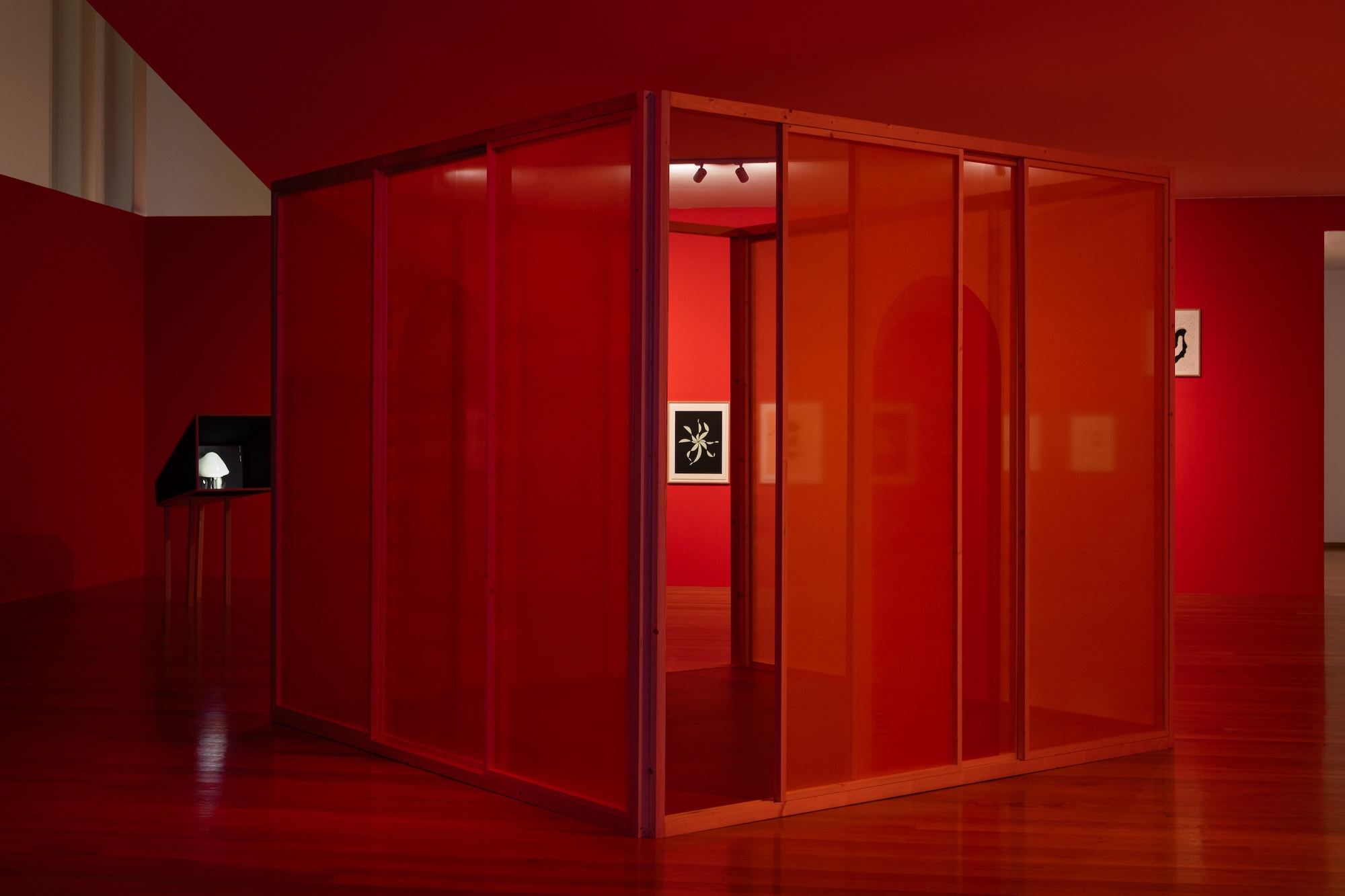 In the darkness of the gallery, lit almost exclusively by the film screens and the light boxes of certain works, with red filters on the windows tinting the afternoon outside, I recognised an emotion which I so often seek in cinemas, and which I would only call "escapism" out of carelessness or modesty. Rather, it is the certainty of gaining access to another time: an emancipated one, resistant to the constraints of the clock or the chores of daily life, free from the weary yoke of morality and urban biorhythms.