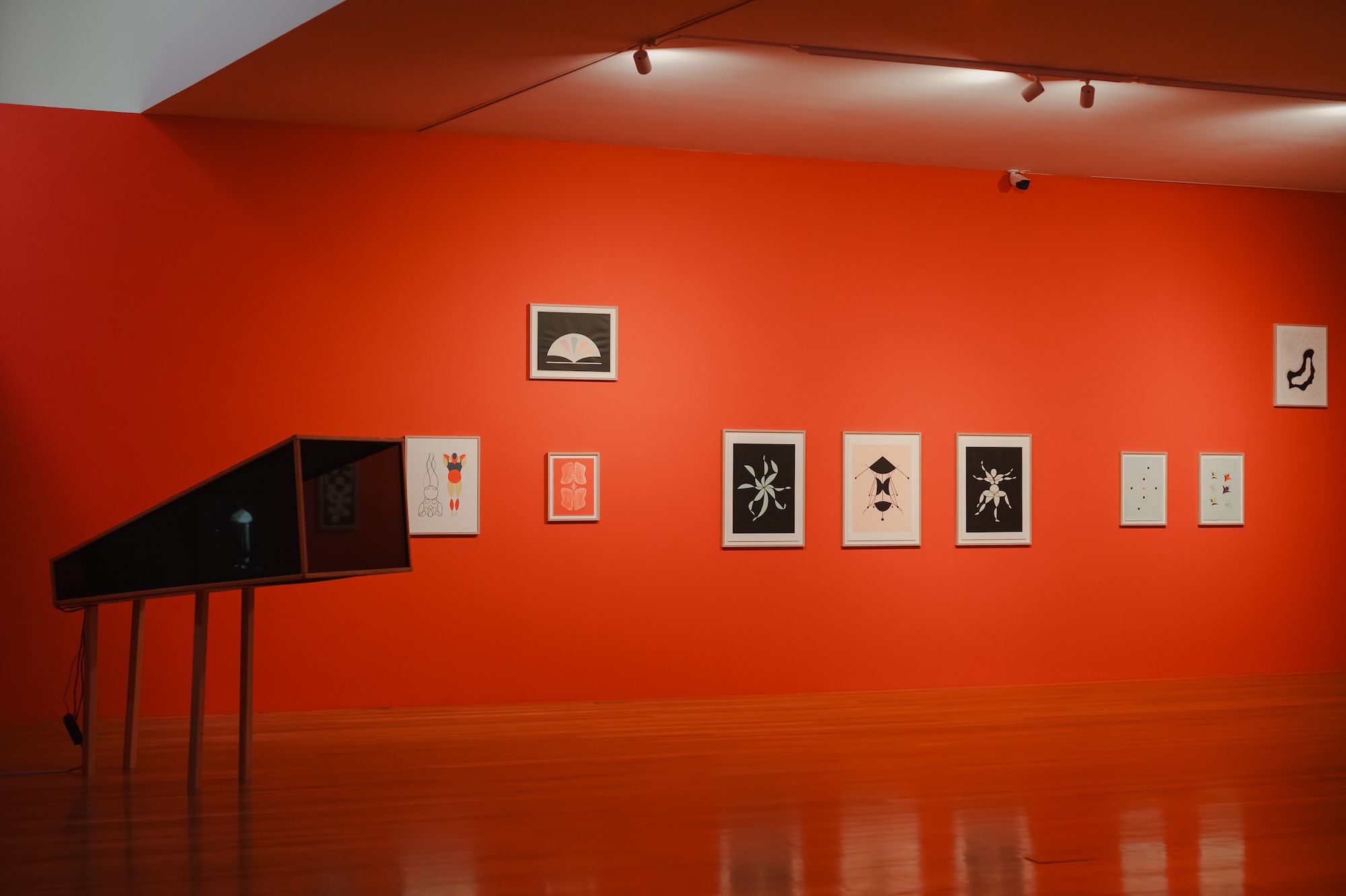 These phantasmagorias of the human, of which all nature seems to bear a trace, are reinforced by moving beams of light that traverse the space, cutting shadows and veils across the works—video and photography, drawings and sculptures that are more or less organic, more or less anatomical—and across the other figures we encounter in the gallery’s nocturnal atmosphere. Shadow, silk, and veils strike me, moreover, as key interpretative tools for reading Caló and Queimadela’s work, appearing from the outset in Sala de memória para corpo radial, a wooden and silk structure which, at the beginning of the exhibition, imposes a sensitive, ruby-red, carnal filter upon our gaze.