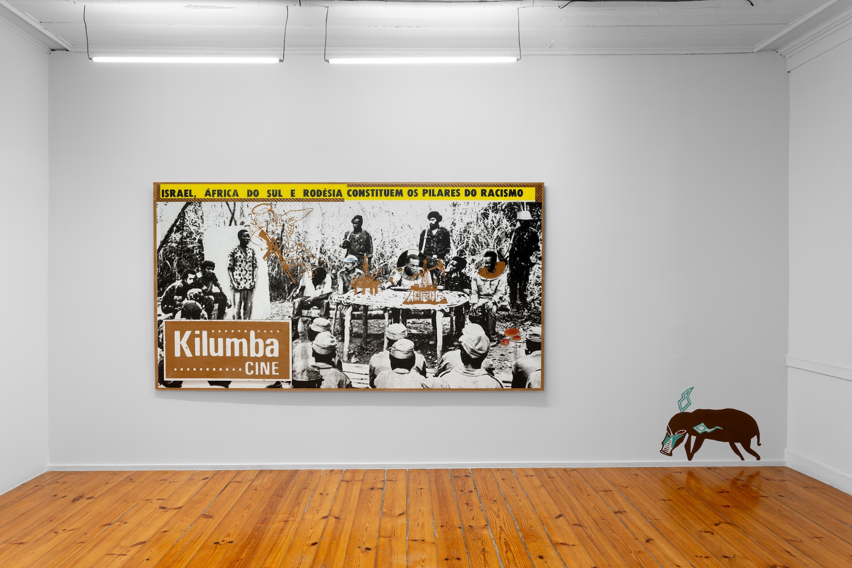 Another piece bears the headline Israel, South Africa and Rhodesia constitute the pillars of racism. While apartheid has formally ended in the latter two, the same cannot be easily claimed for the first. Beneath it, a wartime photograph is subtly altered: here, Yonamine replaced the faces of two characters so that a young José Eduardo dos Santos, newly involved in the MPLA after studying petroleum engineering in the Soviet Union, occupies the position of the authority giving the speech and showing his comrades the strategies to be followed on the map, in which the artist has carved out different oil platforms in the map. These two interventions allude to the following subordination of the revolutionary ideals to economic interests, as well as to the fact that the once revolutionary Dos Santos would later preside over Angola from 1979 to 2017, a period marked by corruption and the expansion of the oil industry. In the same room, we find another cardboard piece, Keep AKA. Here the title itself operates as a wordplay, merging Cinema Kipaka, a well-known cinema in Luanda, with Keep AKA—“keep your gun”—a reference to the armistice following Angola’s civil war, after which weapons were never fully surrendered. The piece presents the carved out logo of the cinema together with the news on the seizure of a marijuana plantation, revealing Angola’s abandonment of long-standing tradition of cannabis cultivation in favour of Western prohibitionist models. The article even absurdly attributes Jimi Hendrix’s death to the substance. Yonamine intervenes by adding a to the farmer’s head, a headdress made of thirty-three joint ends —not a casual number, a charged one, invoking Masonic symbolism, Christ last year, as well as the amount of rolling papers in a standard pack.