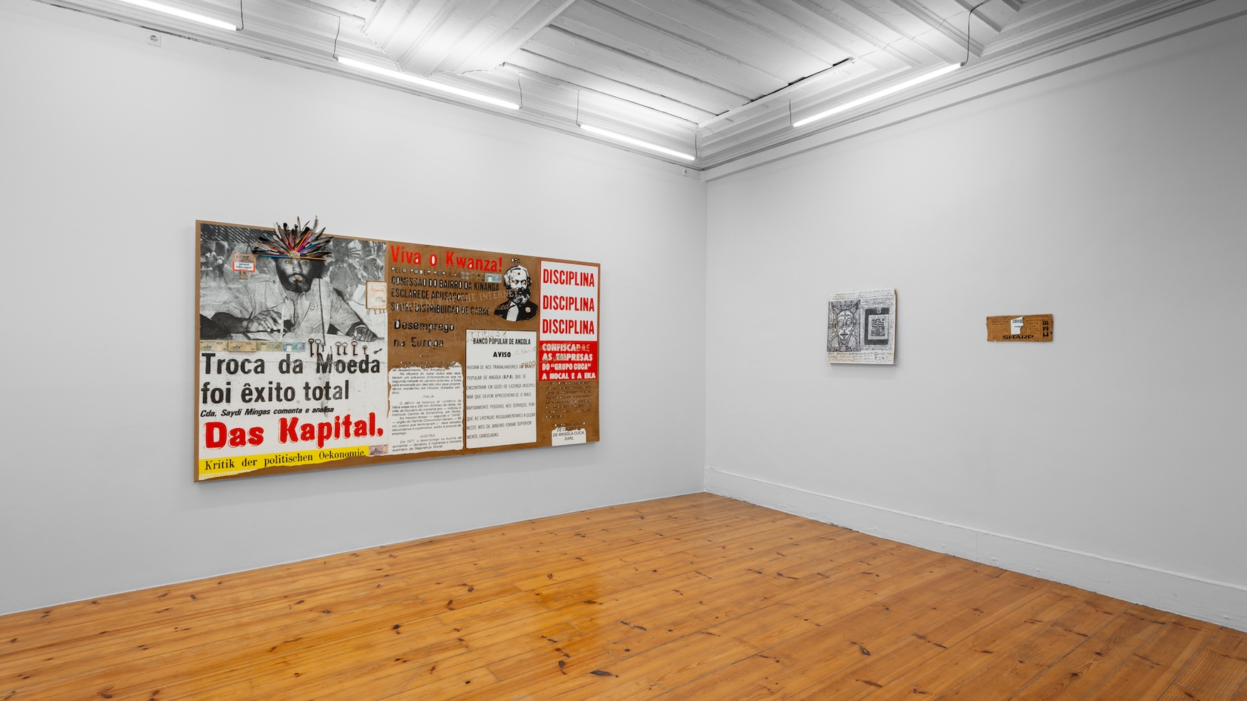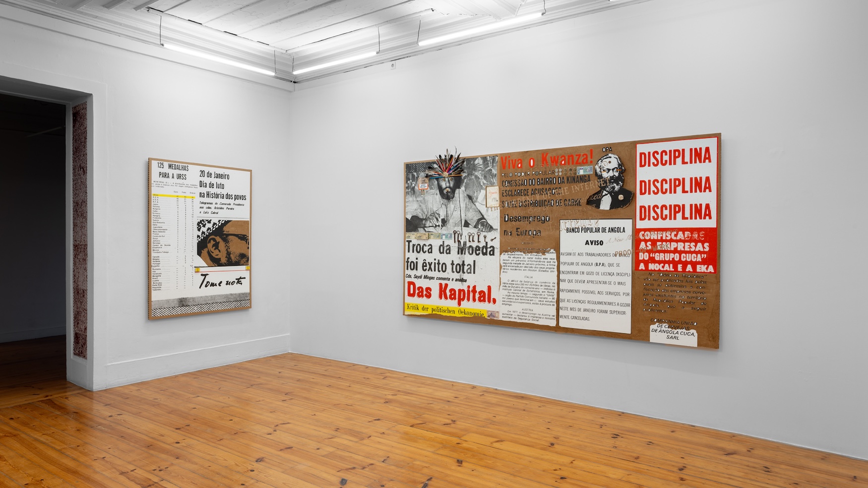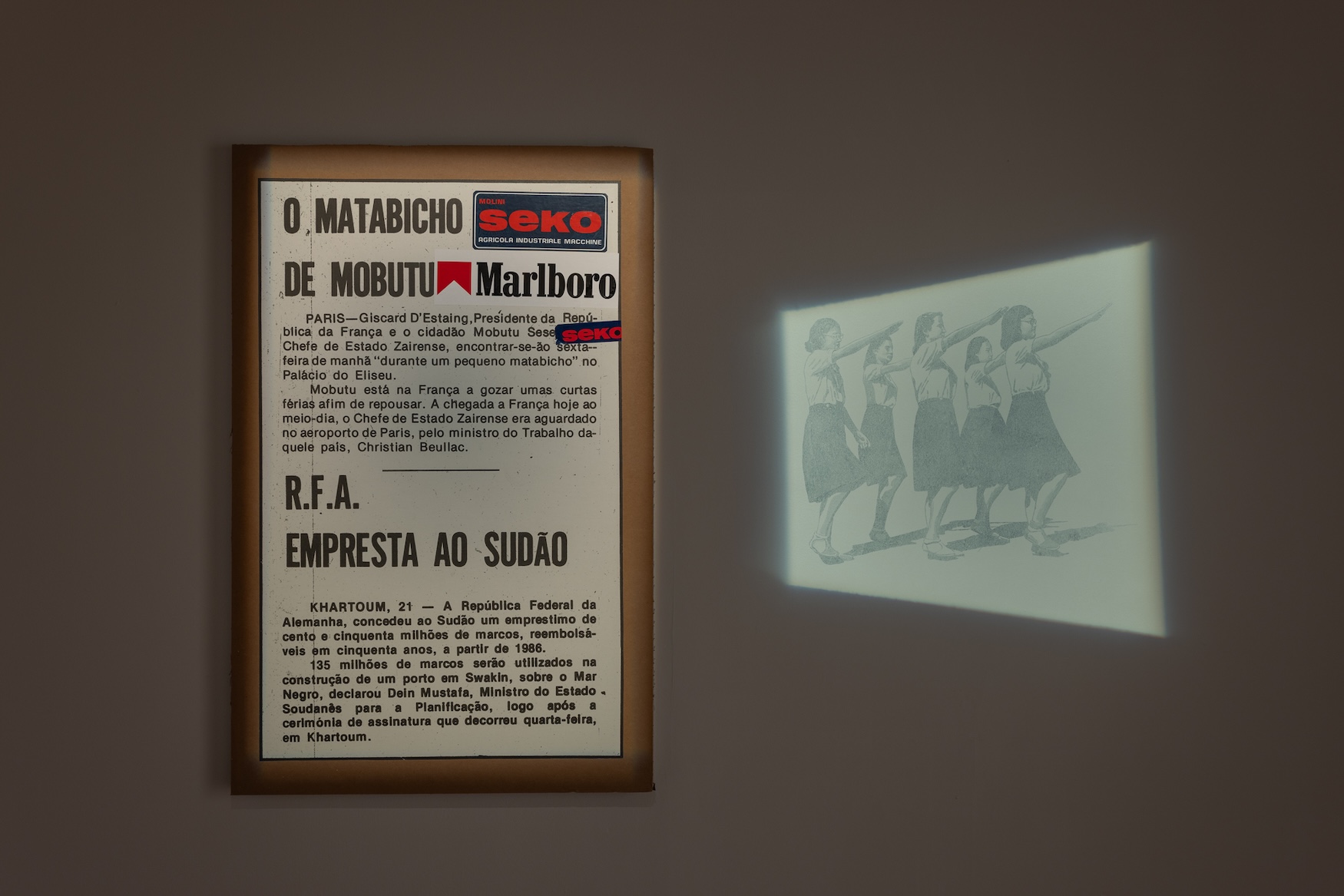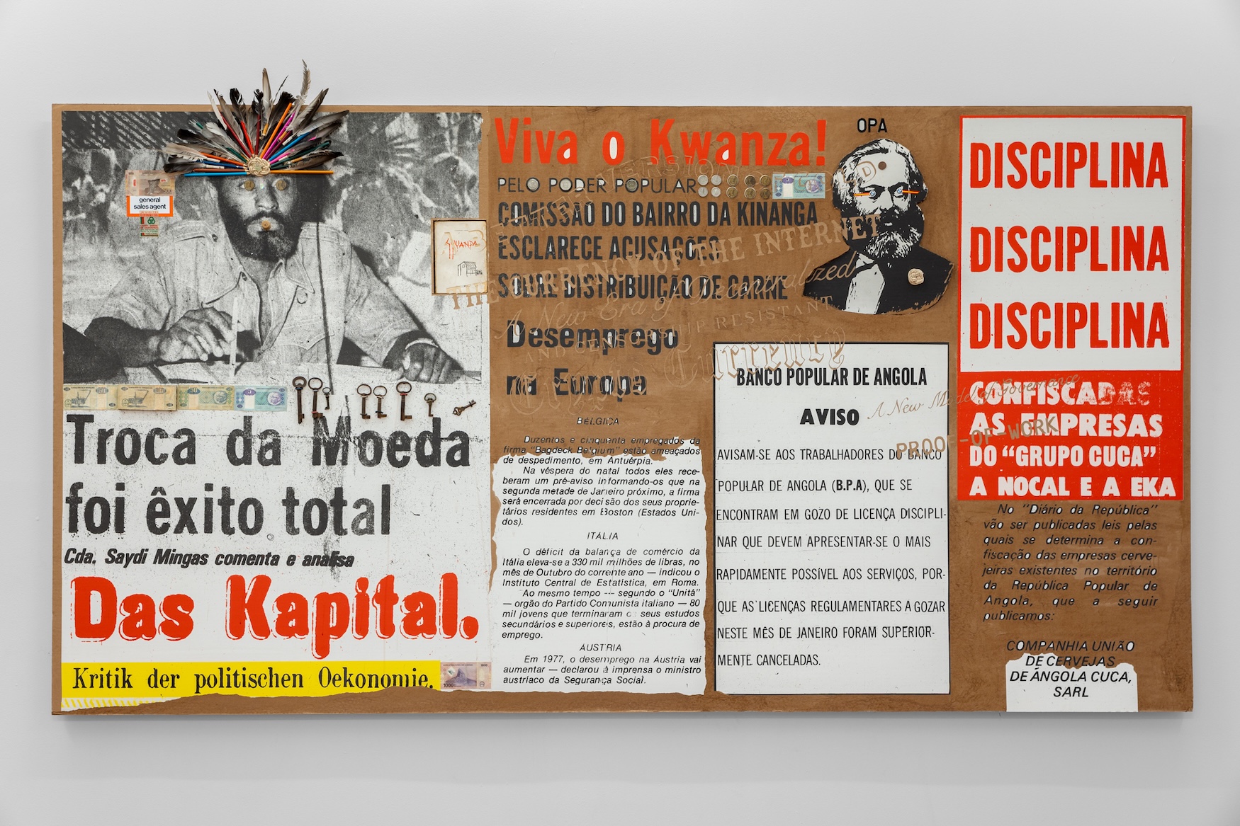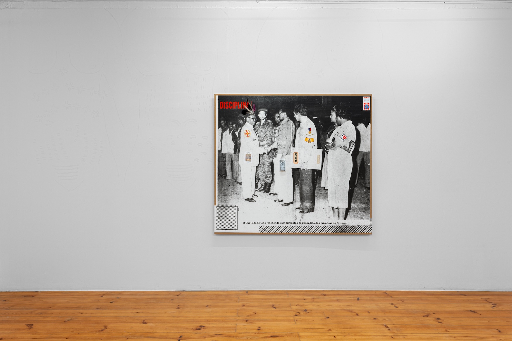 The first return is twofold. In Memoria Fantasma, Yonamine revisits the history of his country while simultaneously returning to an earlier work in which he had already done so. Most of the pieces presented here are revisited versions of works first shown in 2013 at the Museu Coleção Berardo, for the group exhibition No Fly Zone. Unlimited Mileage2. On that occasion, Yonamine created a series of large cardboard panels composed of different manipulated fragments of the Jornal de Angola of 1976 —the first year of independence of the country under a Marxist government. More than a decade after these works were first shown, during the year that marked the fiftieth anniversary of Angola’s independence from Portugal, Yonamine decided to ‘update’ these works to make them speak again about the reality of his country and the twisted world in which we live.