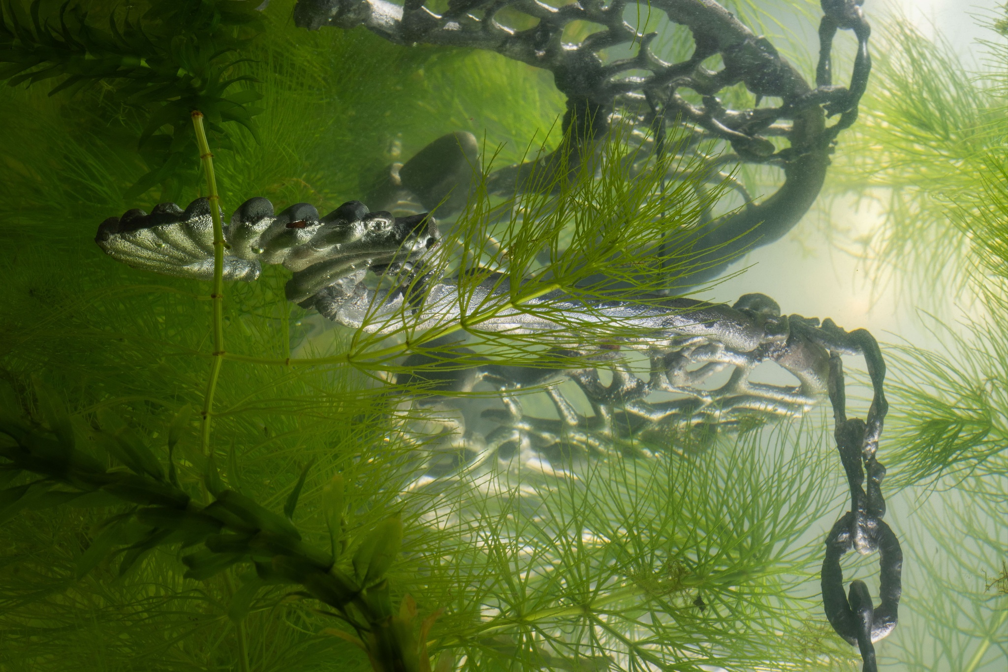 Evian Wenyi Zhang, Mirror with dragon (pormenor), 2025. Suporte de aço inoxidável, aquário, lata, bomba de ar, algas, projetor. Foto: Bruno Lopes. Cortesia de Pedro Cera.