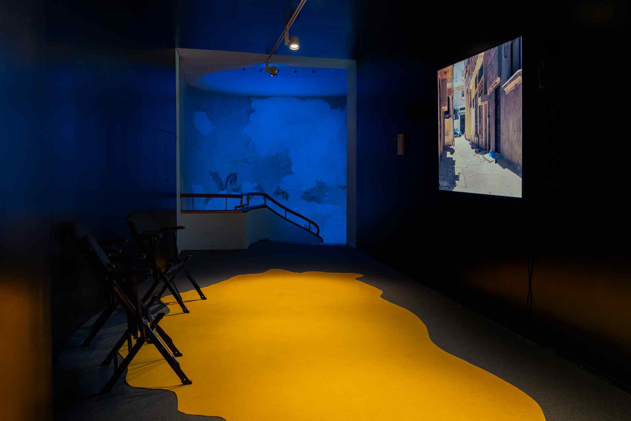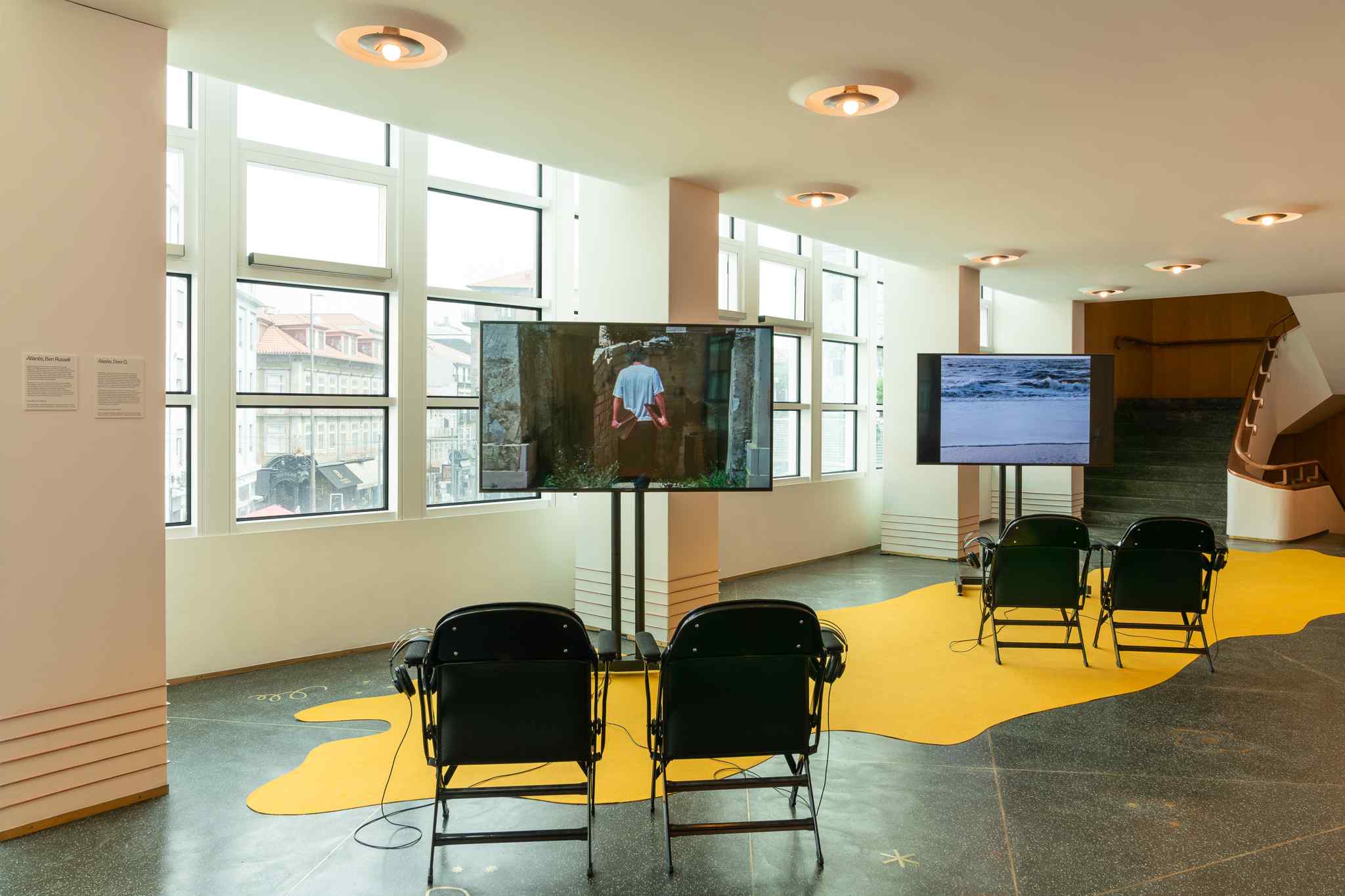 SCB: A exposição surgiu de um convite do Batalha Centro de Cinema, e foi particularmente estimulante porque trabalhei a partir de duas coisas novas. A primeira é que o convite já vinha com uma proposta de tema, a ‘praia’, e foi a primeira vez que não fui eu a definir a ideia de base da exposição. Contudo, o Batalha deu-me autonomia total para trabalhar esta temática de forma livre. A segunda particularidade é que a exposição devia ocupar todo o edifício, os filmes tinham de estar espacializados por várias zonas do Batalha, fora e dentro das salas, aproveitando o facto de não haver programação dentro do cinema durante esse período. Isto foi desde logo um desafio. Então tive a ideia de integrar formas de iluminação e desenhos no chão, que foram delineados pelo artista Hugo de Almeida Pinho, que tem sido o meu cúmplice durante todo este percurso, e com quem trabalho frequentemente no design expositivo, e que concebiam um fio condutor na exposição, ao mesmo tempo que remetiam simbolicamente a formas orgânicas da praia.