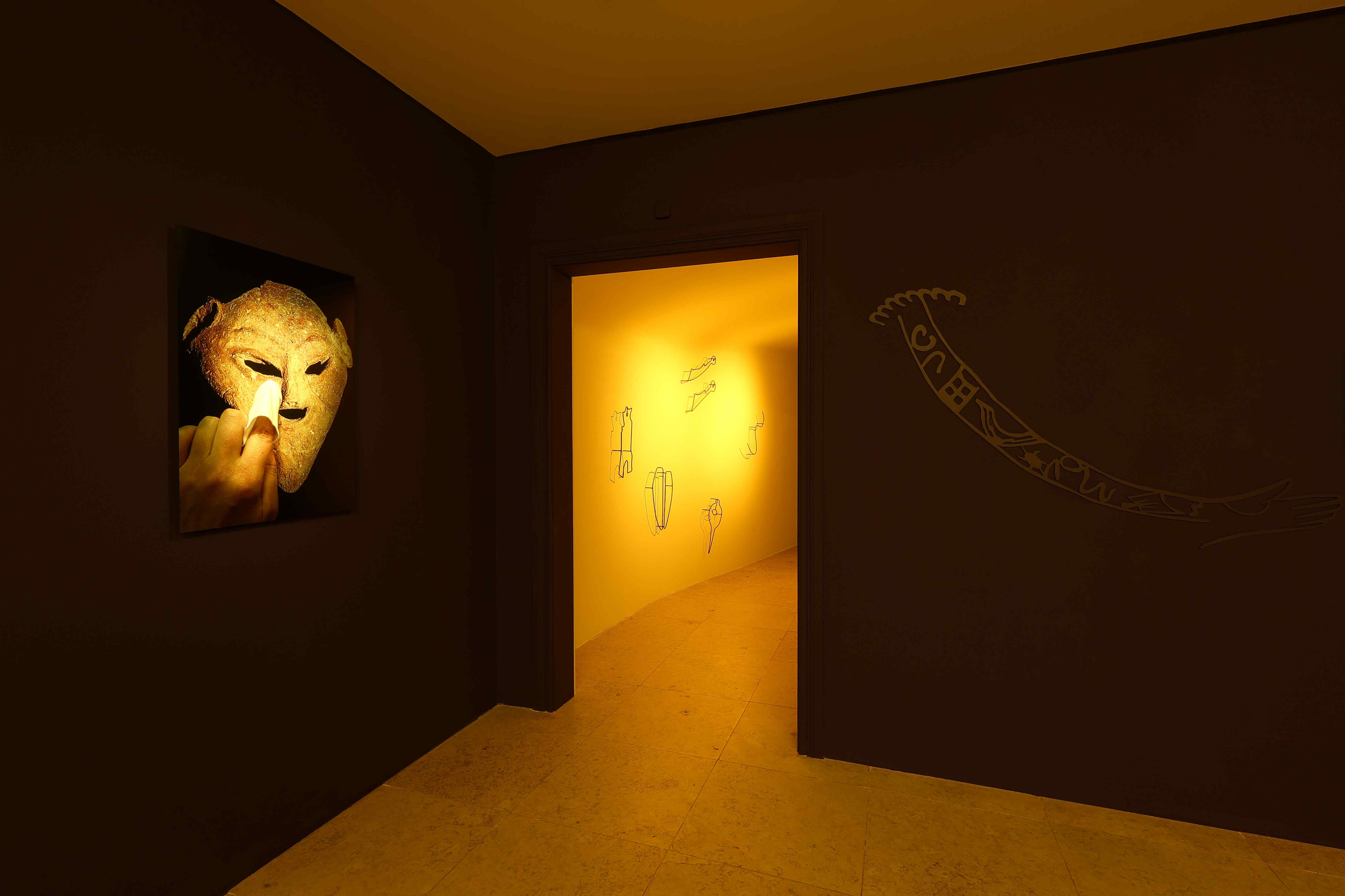 Porém, existia na exposição um dispositivo cenográfico independente que comunicava com as obras. Coloquei uma série de imagens projetadas no chão das várias salas, que iam mudando continuamente, e que representavam referências iconográficas trans-temporais ligadas a um imaginário associado ao misticismo, à magia e ao sagrado. Estas imagens também auxiliaram na adequação da exposição ao espaço industrial do Centro de Arte Oliva, que não é nada fácil de trabalhar, mas tem um chão fantástico para projetar imagens. Portanto, além deste alargamento e diálogo com as obras, estas imagens serviam para redirecionar o olhar noutras direções, tal como de linha de união entre as várias salas da exposição.
