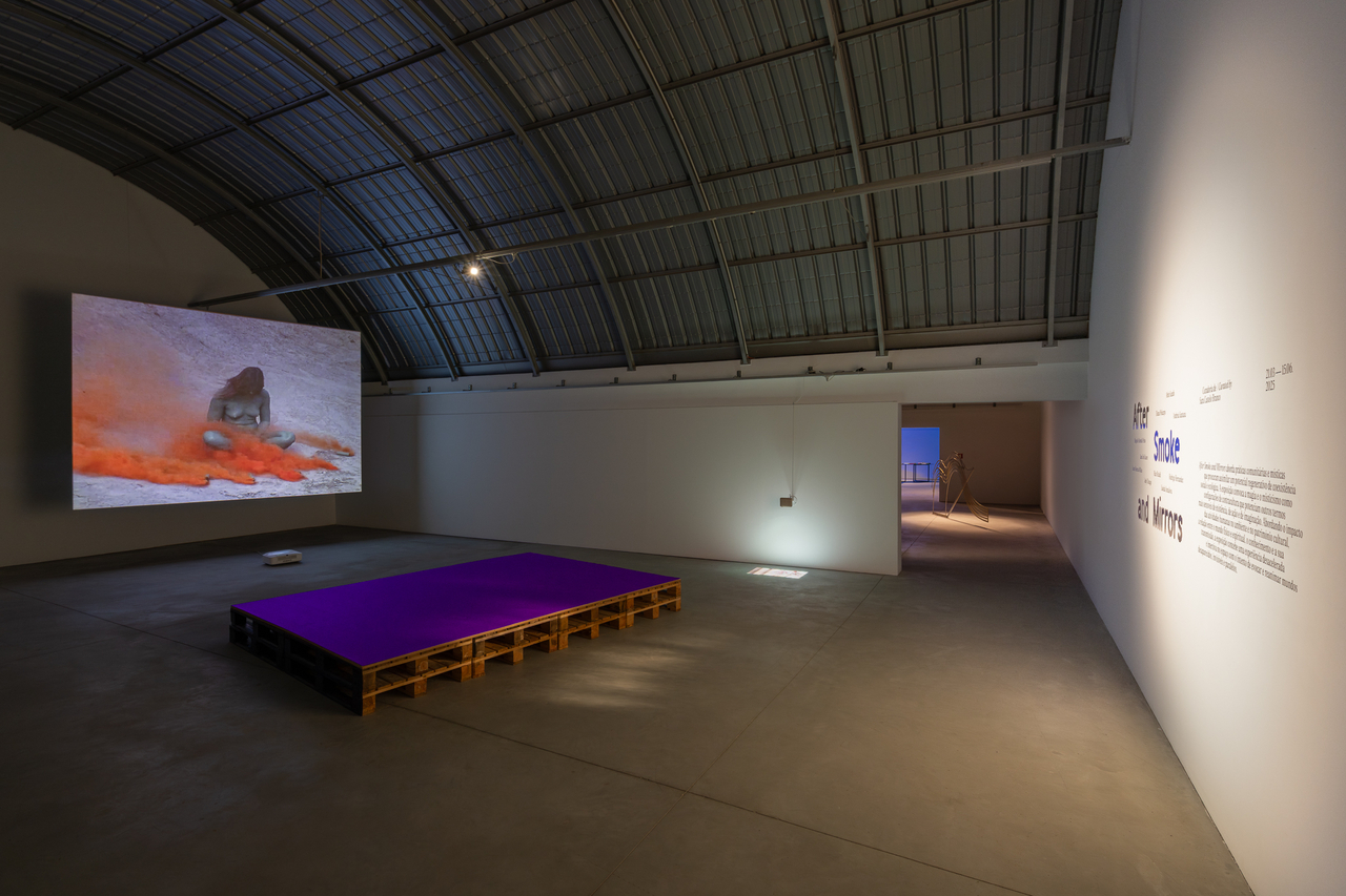 Falando em casos específicos, a escultura da Andreia Santana tinha um tratamento químico iridescente e também podia ser tocada para produzir sons que ecoavam pelas salas, por outro lado relacionava-se com o filme da Jane Jin Kaisen, que também tinha uma dimensão sonora e cósmica muito pulsante, e que se encontrava no mesmo espaço. Por outro lado, as esculturas do Hugo de Almeida Pinho tinham uma patine que produz oxidação e sulfureto de cobre, e iam libertando fumo, ligando-se às paisagens dos filmes da Saodat Ismailova e do Riar Rizaldi, que se encontravam próximos das peças. Estas esculturas também faziam um arco com as ações fumegantes do filme da Judy Chicago na primeira sala da exposição. Por outro lado, a After Smoke and Mirrors evocava um descentramento do sujeito humano, algo que surgia nos painéis de Rodrigo Hernández e na instalação da Diana Policarpo, que investigava políticas de percepção alterada, que era igualmente a base do filme da Laura Huertas Millán, uma obra que se desenvolvia em torno do caráter rítmico e ritualístico do processo de preparação do pó de coca e de discussões acerca de trabalho, aprendizagem e organização coletiva. Desta forma, as obras iam ressoando umas nas outras, por vezes de uma forma bastante sinestésica, dado que a exposição envolvia o som, o toque, a visão e o olfato.