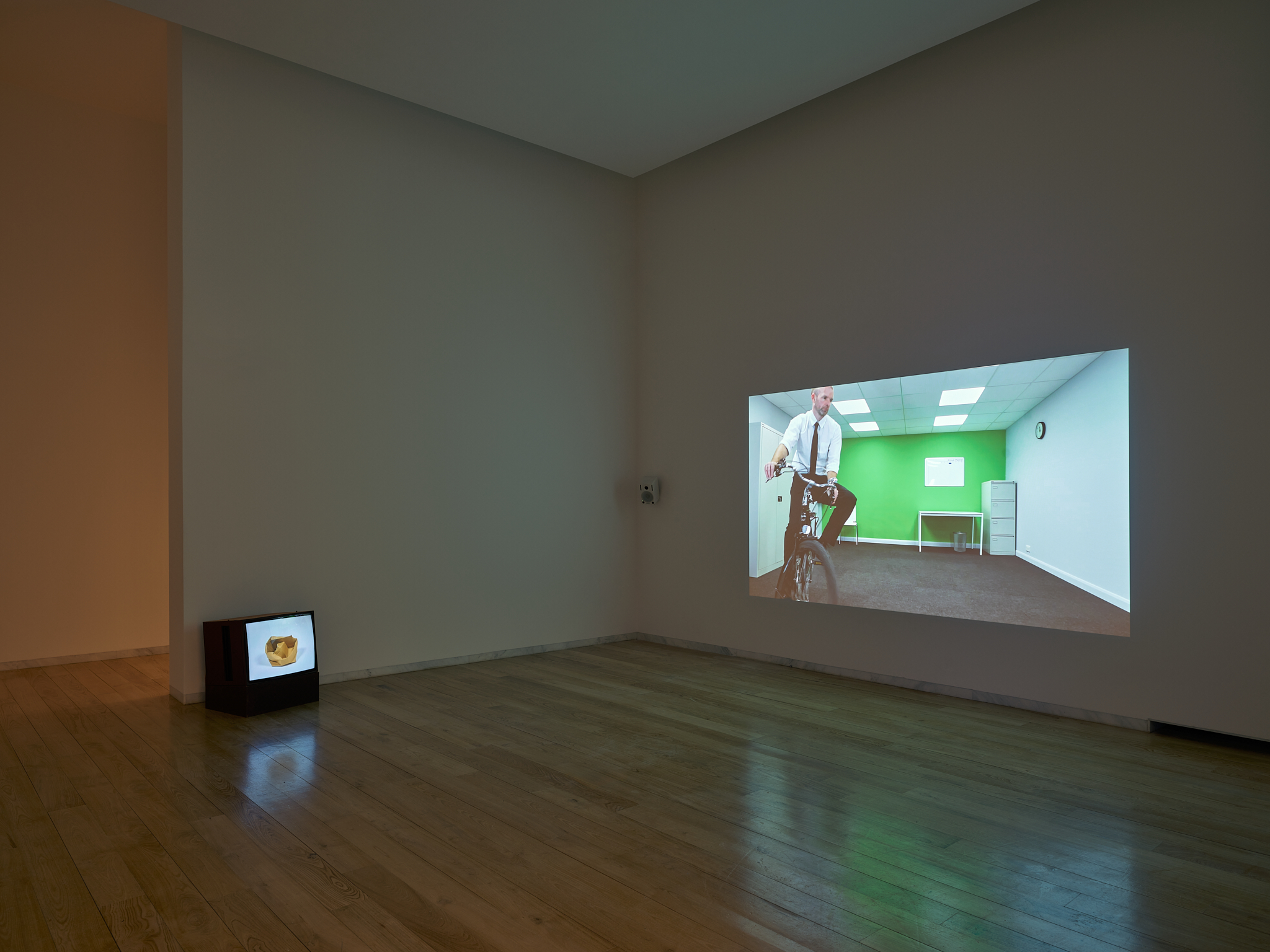 Essa dimensão torna-se imediatamente evidente na instalação Sem título (2003/2026), de Inês Botelho, posicionada à entrada da exposição. Constituída por um sistema de cortinas suspensas que simultaneamente delimitam e abrem o espaço, a obra convoca diretamente o imaginário teatral, criando uma mise-en-scène que coloca o visitante numa posição ambígua entre o lugar de observador e o de participante. O gesto de atravessar as cortinas assume um carácter performativo, marcando simbolicamente a transição entre o dentro e o fora do espaço expositivo.