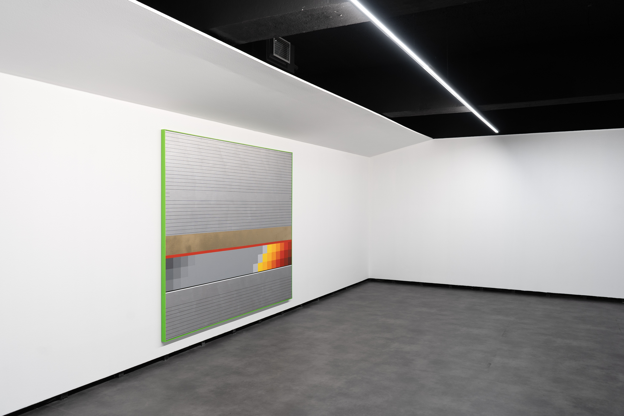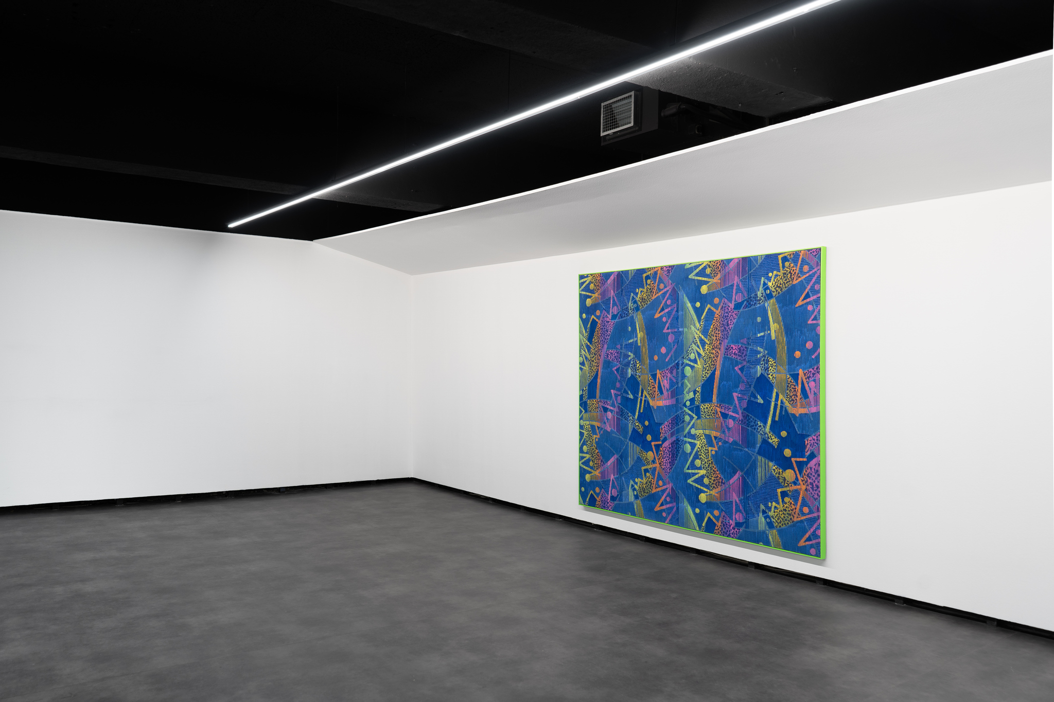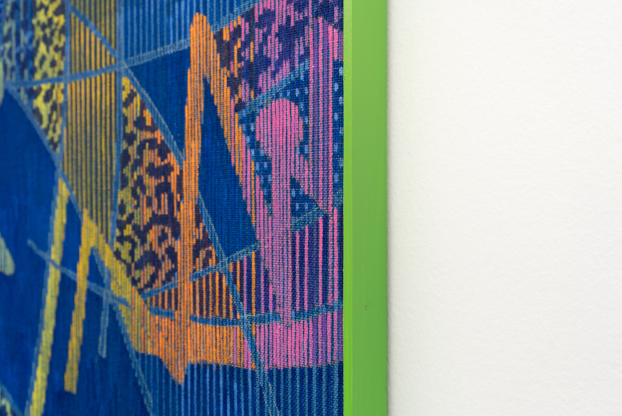 A outra pintura, na parede em frente, fará algo semelhante. A origem, como noutros trabalhos, noutras exposições, nasce de um padrão de um banco de um autocarro. Aqui, também, estamos diante de uma pintura, mas algo se parece animar nas superfícies. Os padrões têm uma força mais cinética que, dir-se-ia, revolve o olhar e entorpece o corpo. O profano transforma-se numa experiência interior que é hipodérmica, visual e musical. Todos os nossos sentidos se acendem diante da pintura, ao ponto de esta nos pedir que nos aproximemos para fazermos da nossa visão um sentido quase háptico. Dito de outro modo, num passo de dança incontornável, tocamos neles com os nossos olhos.