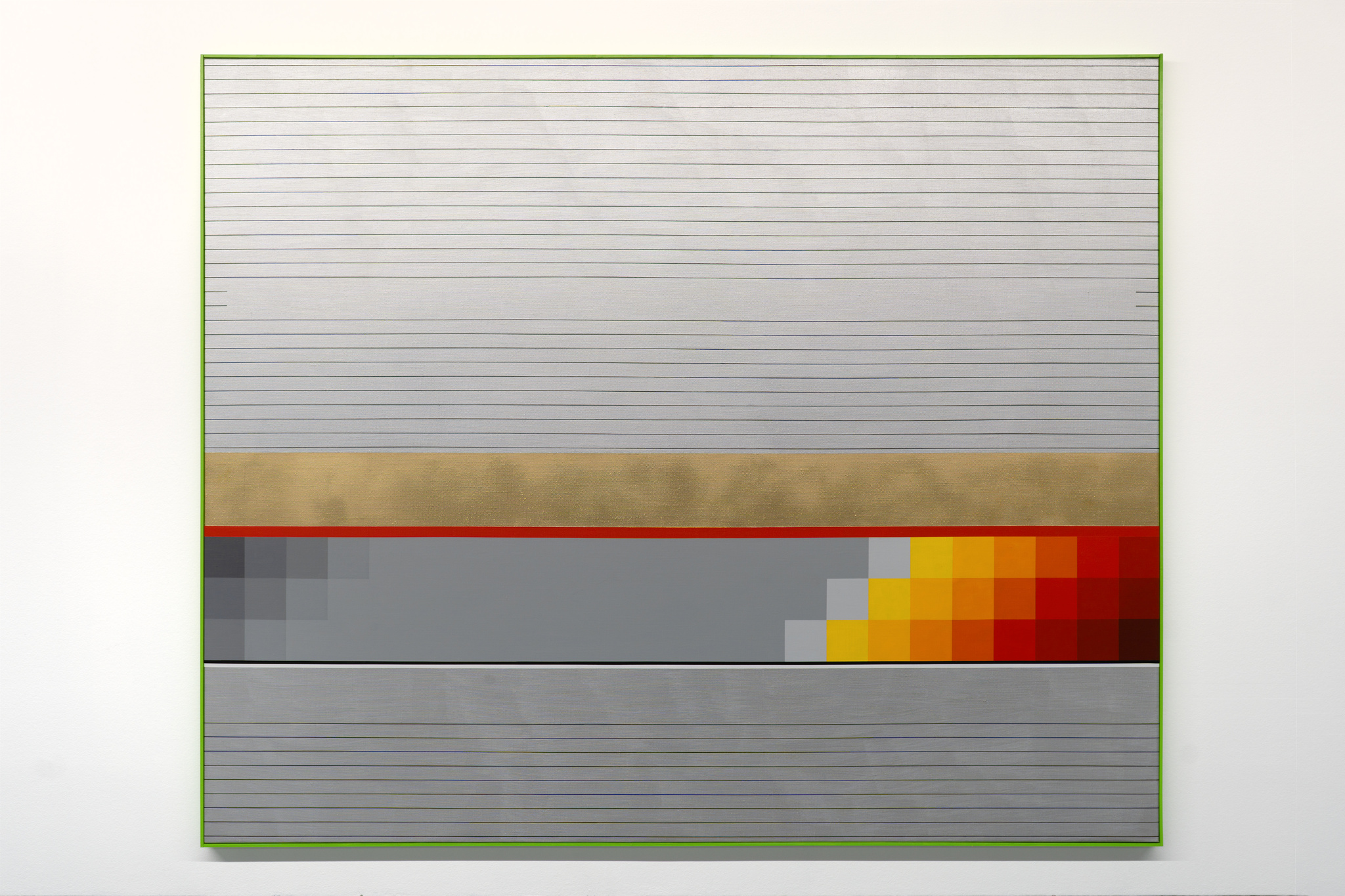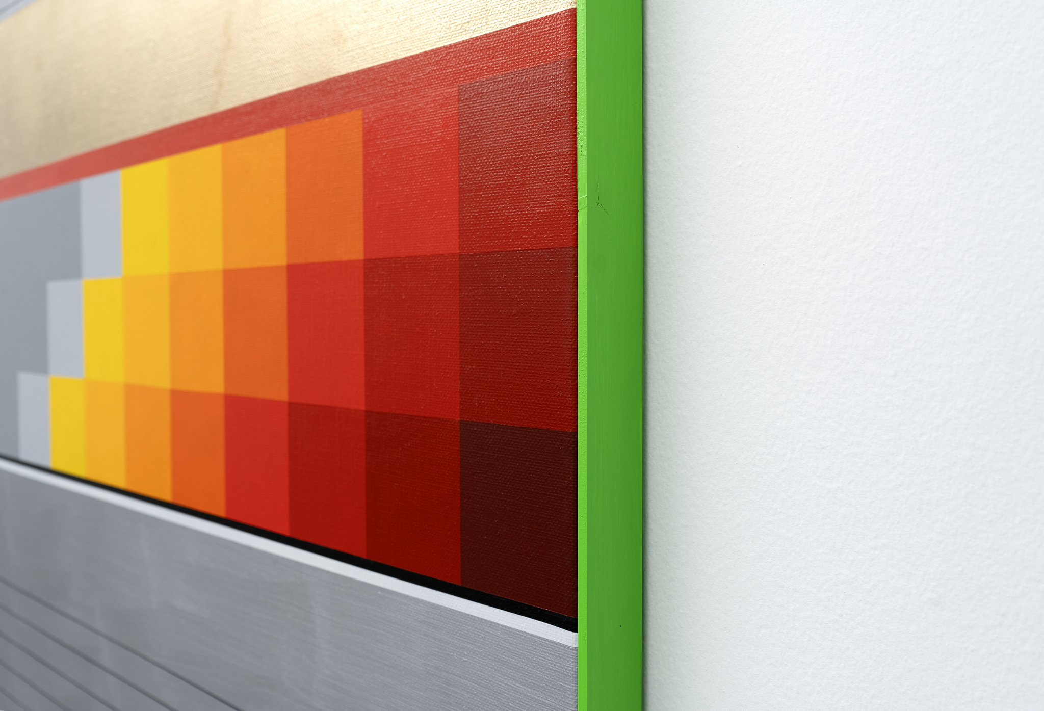 E, no entanto, para lá destas remissões, pelo título somos transportados ao rolo da fotografia. Chegaremos lá, não sem atalhos, pois a imagem original nasce de cortes e das ausências que estes produzem: o artista ao recortar, ao retirar, produziu uma pintura sem a totalidade dos indícios originais (deixados na imagem da caixa). Poderíamos dizer que se trata de pintura, de colagem e corte, que, no fim, o artista deixa-nos cientes da permanência, das condições de possibilidade da pintura. Tanto que, abstracta, ela, pelas suas cores, e pela faixa de cor metálica que a atravessa, podia ser uma imagem produzida digitalmente ou um elemento decorativo de um brinquedo de ficção científica. A aproximação do nosso corpo à pintura desvela a ilusão, aquieta as associações, faz da sedução das linhas e das cores um jogo. Ao mesmo tempo que, das imagens reprodutíveis, nos devolve a presença de uma qualquer aura ou da sua imaginável aparição.