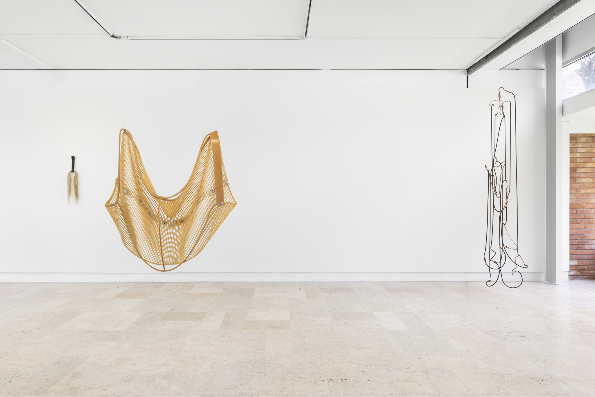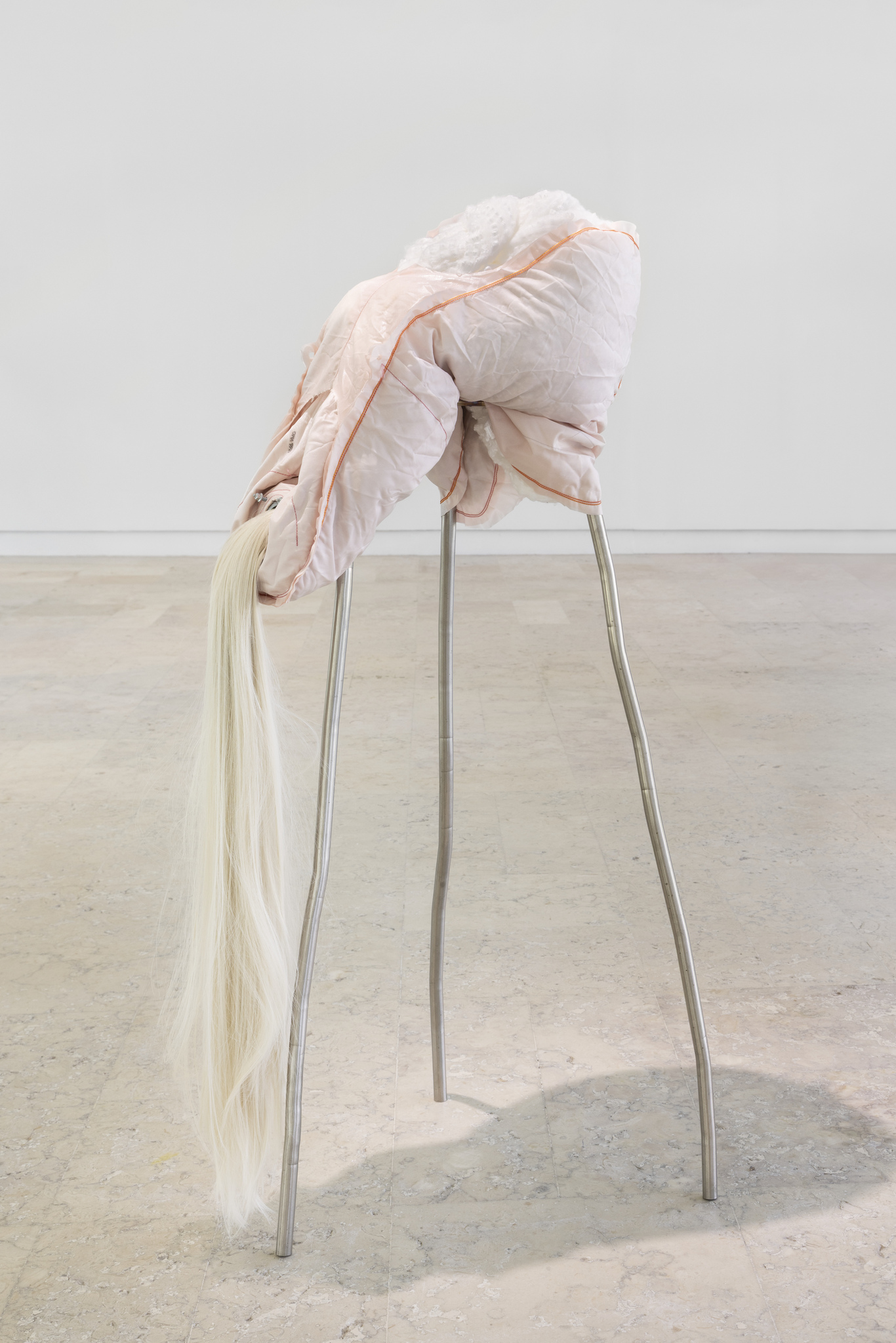 O uso recorrente de pelo nas esculturas intensifica esta tensão. Por um lado, convoca associações de suavidade, aconchego e domesticidade; por outro, remete, como sublinha a curadora, para “maturidade corporal e de identidade sexual, marcas que pertencem simultaneamente ao campo do íntimo e do animal” (Cachola, 2026). A simbologia do pelo, profundamente enraizada em diversas tradições culturais, associa-se frequentemente à proteção, ao instinto, à vitalidade e à ligação com uma dimensão selvagem ou primordial do ser. Enquanto revestimento, o pelo funciona como fronteira entre interior e exterior, como superfície de contacto e defesa, mas também como extensão energética do corpo, capaz de sugerir tanto conforto como ferocidade.