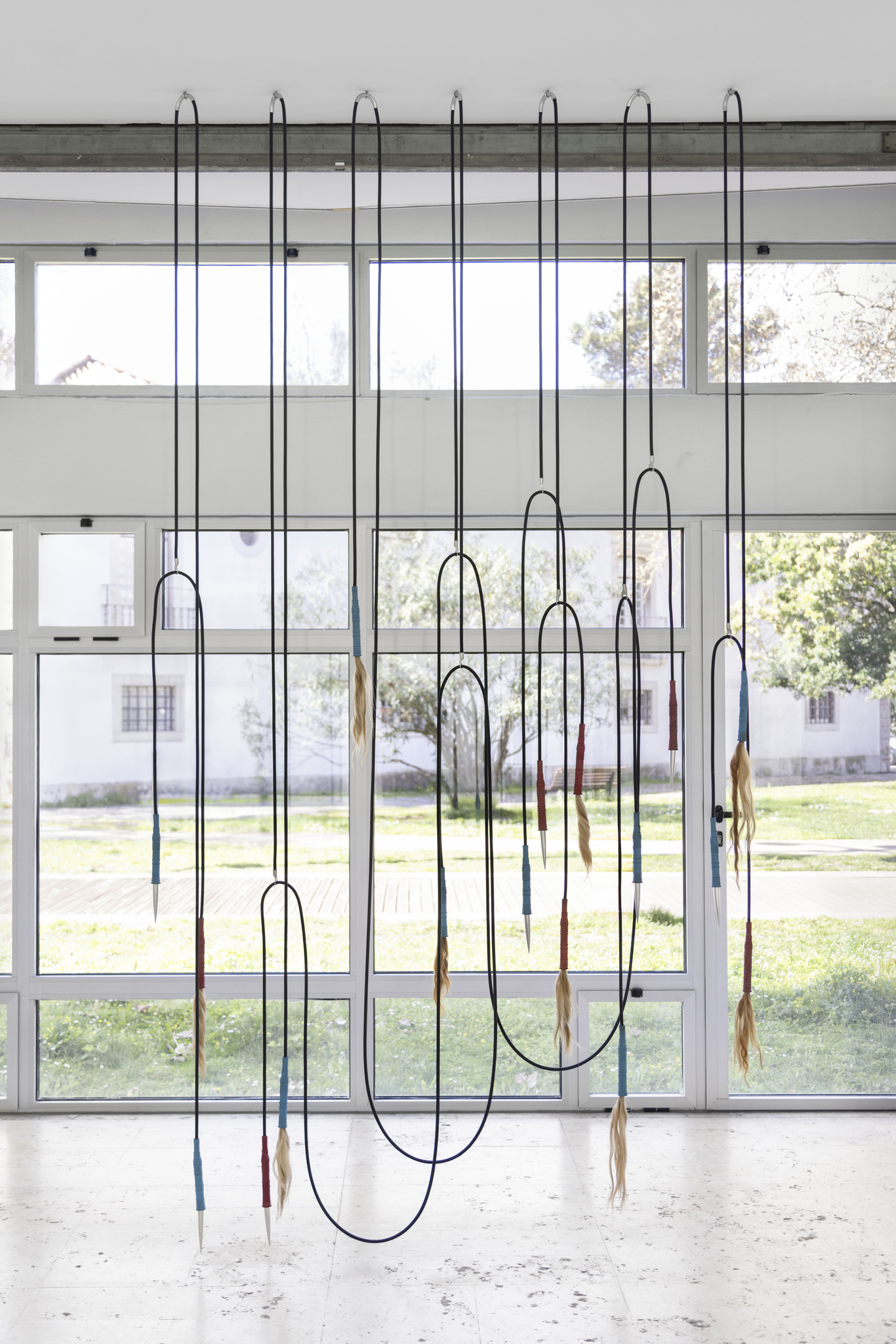 Já as três pernas, frequentemente construídas a partir de resistências helicoidais industriais e utilizadas em sistemas de climatização e estufas industriais, evocam a forma de DNA. O tripé adquire múltiplas conotações simbólicas: equilíbrio, estabilidade, ciclo vital, temporalidade e até configurações relacionais, como o triângulo amoroso. Esta sobreposição de significados reforça a natureza polissémica das esculturas. Na exposição, encontramos tripés com pelo, parte de uma série em curso iniciada em 2023. A série, nas palavras da artista, opera “como uma família em reprodução” (Pacheco, 2026), tendo cada ser, apesar das semelhanças inerentes a pertencerem à mesma família, a sua própria personalidade e identidade. Cada criatura recebe um nome próprio, inspirado na nomenclatura usada para as gerações de espécies híbridas (F1 – First Filial, F2 – Second Generation), às quais se acrescentam mutações, como albinos ou pedrez/barred, numa referência à manipulação genética e à seleção artificial.