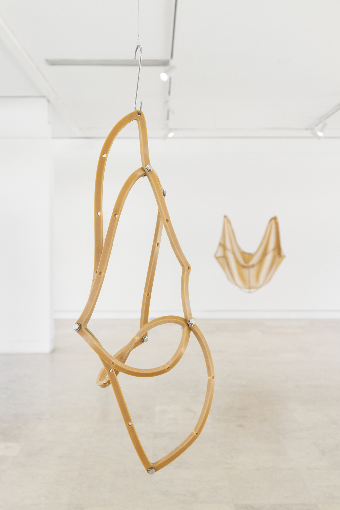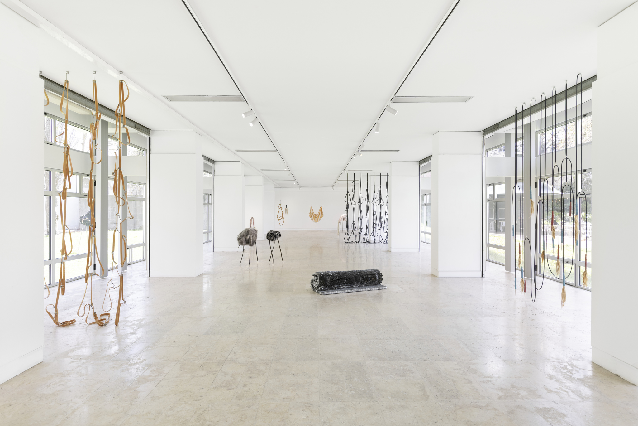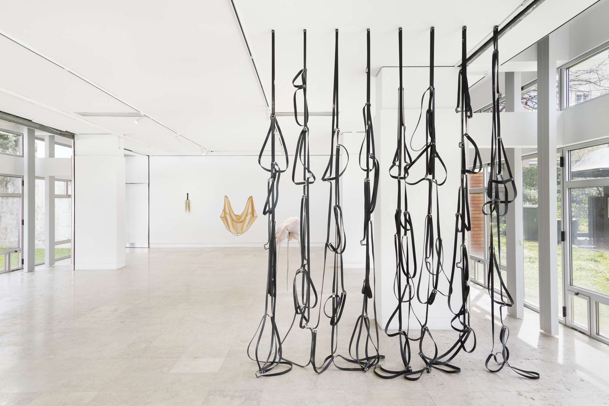 Ao longo da exposição, somos confrontados com uma série de ambiguidades visuais e afetivas que tensionam a experiência do olhar. O prazer sensorial é constantemente atravessado por uma latente sensação de ameaça. Logo à entrada, um delicado par de sapatilhas de ballet, com dentes e ossos, introduz uma dissonância perturbadora: será este objeto sensual, agressivo, ou ambos em simultâneo? Umas sapatilhas que mordem para evocar o poder feminino, é simultaneamente elegante e sinistra. Esta ambivalência constitui um dos eixos centrais da exposição. Importa notar que estas figuras híbridas são invariavelmente acéfalas e, em muitos casos, dotadas de três membros inferiores que, como recorda Cristina Nabais no contexto da exposição A Flock, A Pack, A Pest, A Breed (2024), é uma impossibilidade biológica que sublinha a sua condição de entidades para além do normativo.