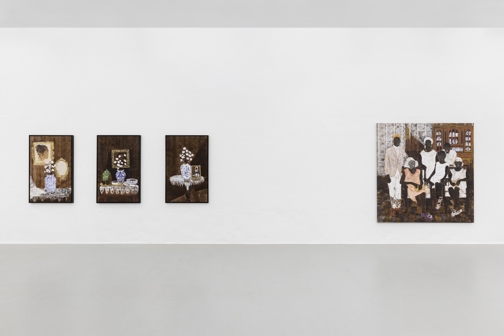 Junto ao retrato de família, o tríptico O espelho da minha história (2025) mostra ramos de algodão em vasos de porcelana azul e branca. Se, à primeira vista, estas imagens podem parecer apenas naturezas mortas, numa leitura mais atenta, somos remetidos para as histórias do comércio colonial e da violência do trabalho escravizado que sustentou a economia algodoeira. A justaposição de elementos domésticos, aparentemente suaves e decorativos, com histórias coloniais, de uma violência inimaginável, demonstram aqui como as narrativas oficiais, que chegam aos livros como História (regra geral, glorificada e romantizada) de uma ou de outra nação, ocultam e suavizam legados de violência, injustiça e extrativismo.