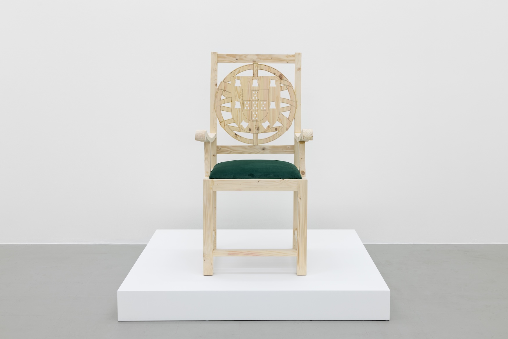 O brasão reaparece em The next future (2025), nas costas de uma cadeira de madeira com o assento de veludo verde. A referência é à “cadeira dos leões” presente no Gabinete Oficial do Presidente da República Portuguesa. Tal como “Pessoa” por trás do véu, leva-nos às ideias e sentimentos de poder e de exclusão. Enquanto The next future apresenta um lugar vazio (para o preenchermos, teremos de usar a imaginação ou ocupá-lo fisicamente), do outro lado da sala, na pintura My place of reflection (2025) a mesma cadeira surge ocupada por uma mulher sentada numa postura demonstrativa de segurança e de poder. Neste diálogo, cria-se um jogo entre poder e representação: afinal o lugar da mulher, e em particular da mulher racializada, apesar das diferenças contextuais de cada sociedade, é um lugar muito mais associado ao silêncio, à invisibilidade e à subserviência do que ao lugar do mais alto representante de Estado. Em última instância, ao propor para este lugar um corpo que tradicionalmente foi (e continua a ser) negado posições de autoridade, René Tavares convida-nos a imaginar um futuro no qual atores marginalizados reclamam o seu lugar de agentes, protagonistas, que contam narrativas a partir das suas próprias experiências e desejos.