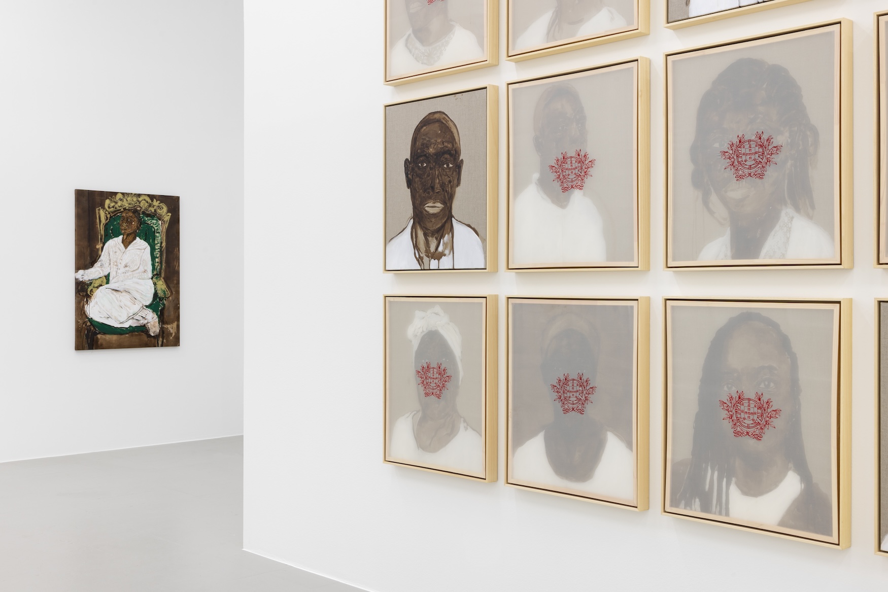 Na Kunsthalle Lissabon, Luso-portugueses é composto exclusivamente por novos trabalhos que expandem estes objetos de investigação. Na “Pessoa” por trás do véu (2025), 24 rostos, dos quais 16 aparecem sobrepostos por um véu translúcido com o Brasão de Armas de Portugal, confrontam-nos como que a interrogar-nos. Mais do que um simples emblema, o brasão convoca-nos a questionar quem tem direito a possuí-lo e o que significa verdadeiramente carregá-lo, revelando não apenas quem nele se inclui e quem dele se exclui, mas também as marcas profundas de herança, poder e reconhecimento (ou da sua ausência) que se inscrevem nesse símbolo. Perante “Pessoa” por trás do véu é inevitável não lembrar uma obra anterior de René Tavares, Piá mú / olha para mim (2022), um conjunto de tábuas de madeira usadas tradicionalmente para pisar malaguetas em São Tomé e Príncipe tornadas suporte para retratos de pessoas da comunidade angolar do sul da ilha, uma comunidade piscatória que resistiu ao colonialismo. Estes suportes aparecem colados a moldes de espelhos que facilmente associamos à classe média alta de um país Ocidental realçando, por um lado, a impossibilidade de nos circunscrevermos unicamente a um contexto geográfico e, por outro lado, os regimes de pertença e de exclusão.