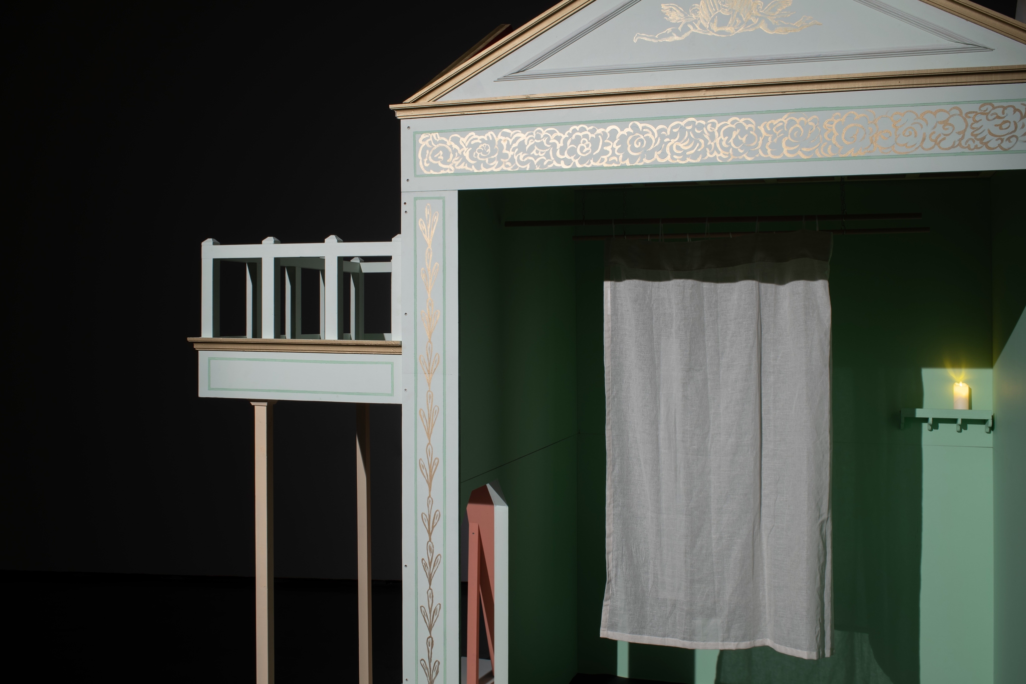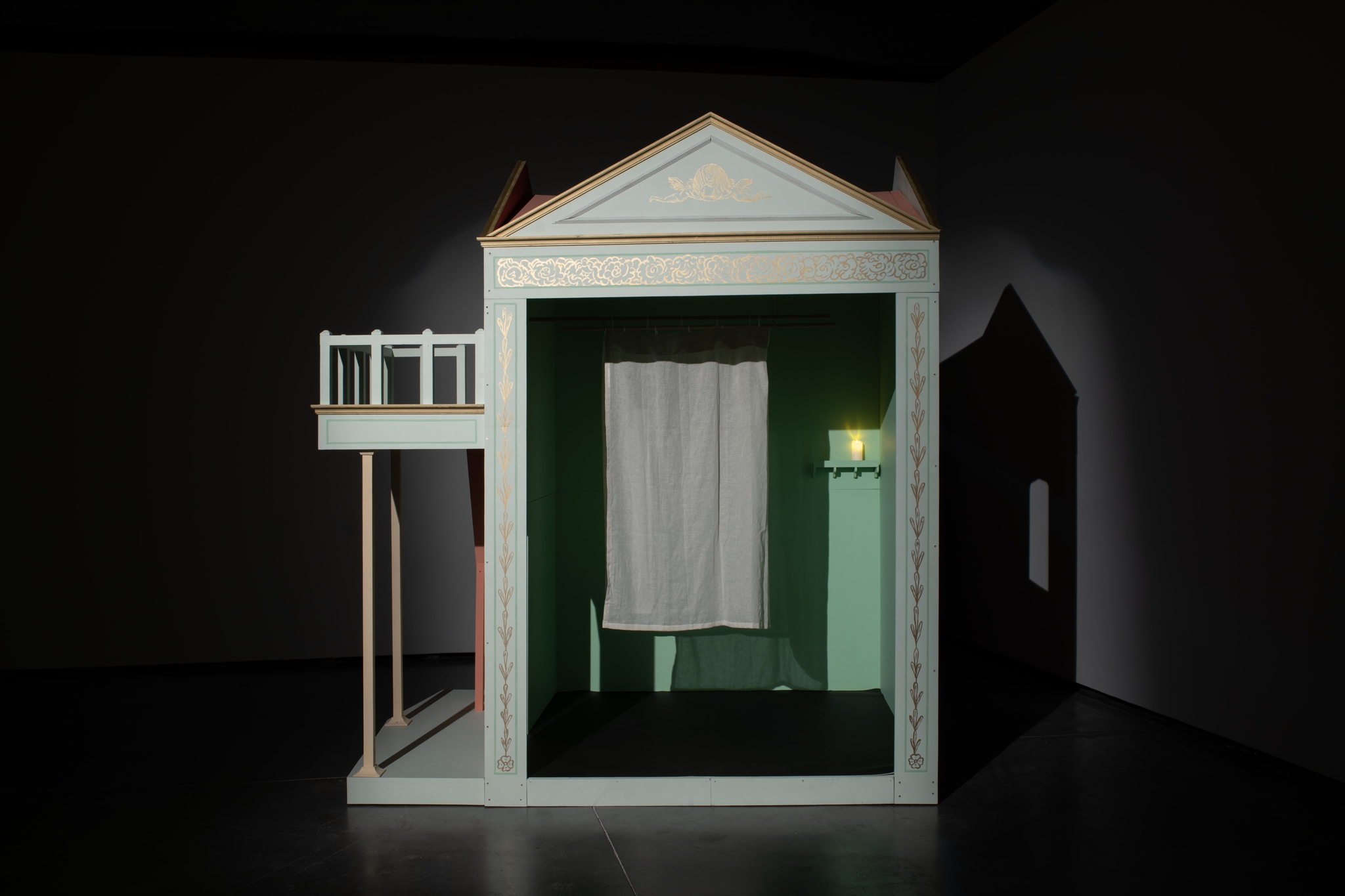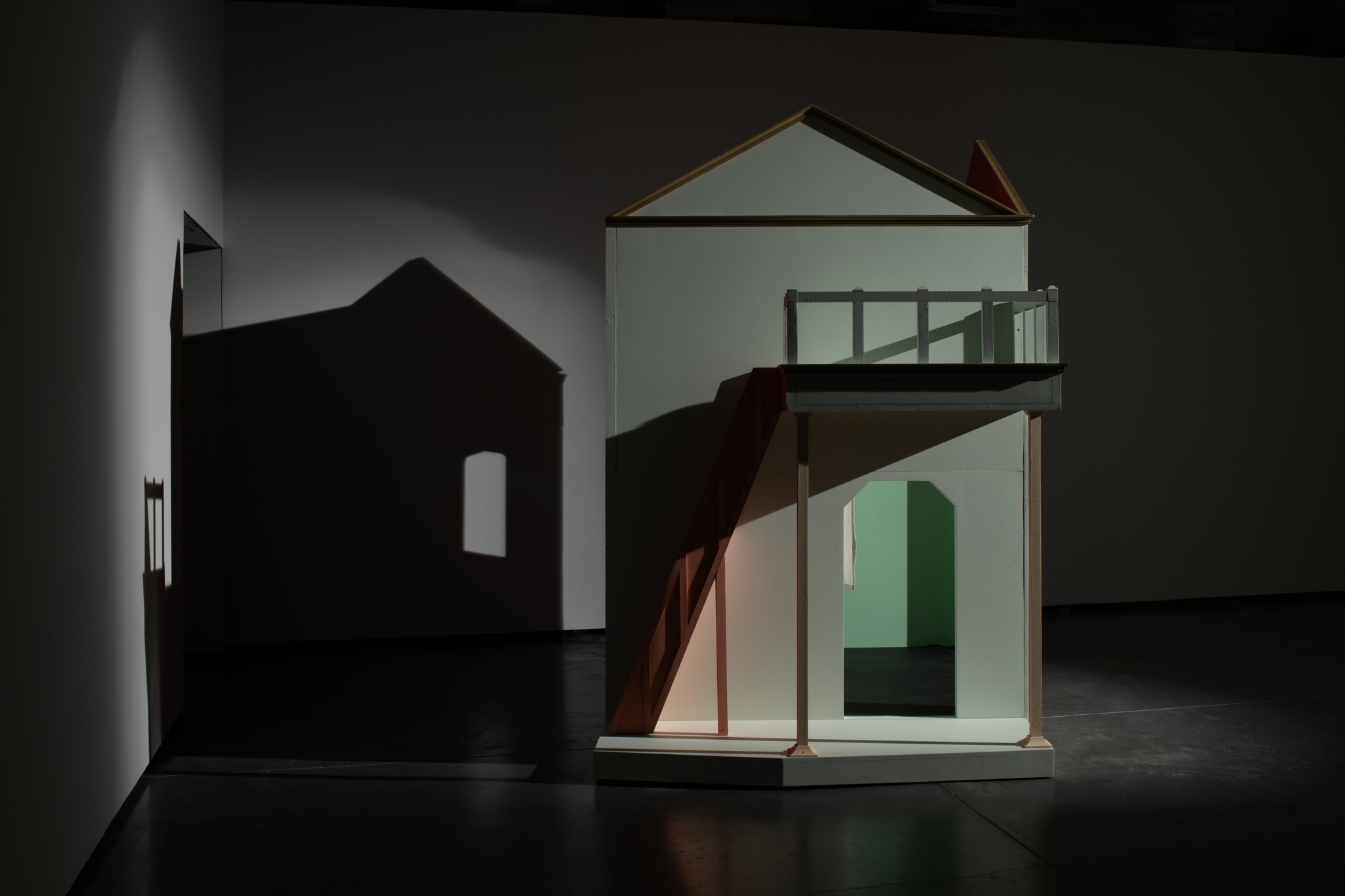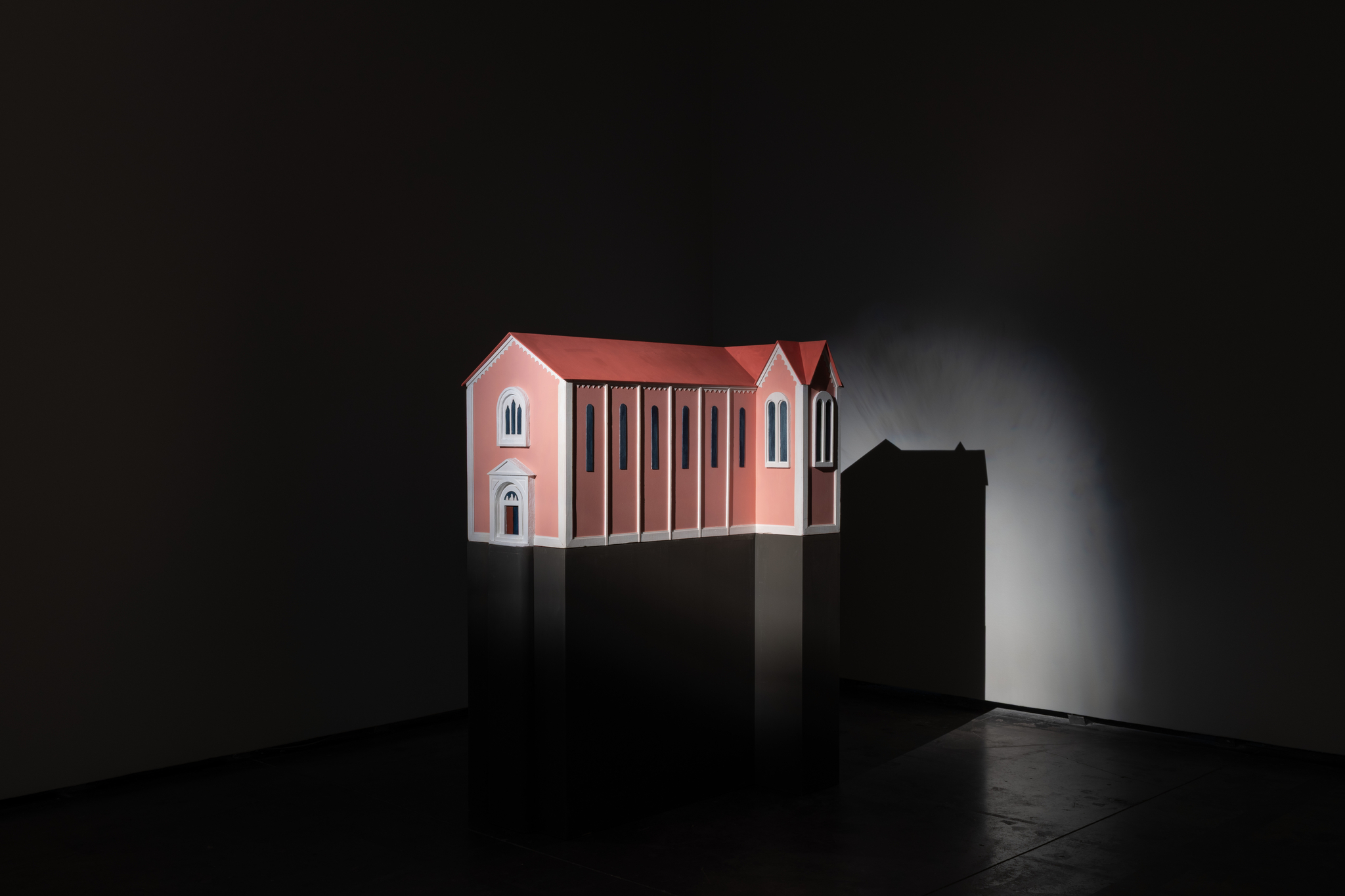 A actividade artística de Sara (n. 1980) & André (n. 1979) articula-se num território onde objecto, imagem e reconhecimento visual convergem, reflectindo sobre um propósito de absorção e de questionamento da própria História da Arte. O ponto de partida — e de chegada — desta proposta expositiva é a célebre Cappella degli Scrovegni, também conhecida como Capela Arena, em Pádua, que alberga as pinturas mais reconhecidas de Giotto, aqui reproduzida de modo estilizado no seu exterior, constituindo uma das duas peças do conjunto. A que identificamos como a peça principal da exposição, de um modo original, manifesta a sua materialidade — tridimensional — reproduzindo o formato — bidimensional — do fresco de Giotto Anunciação a Sant’Ana. Aqui a casa está vazia, diferentemete do fresco habitado, mas tudo nos reporta para a solenidade do silêncio e da narrativa bíblica, destacando-se a única vela a iluminar, que iconograficamente simboliza a chama de Cristo. A casa revela-se de modo elegante nas suas cores opalinas, na suavidade da cortina, no silêncio do alpendre, na presença pressentida.