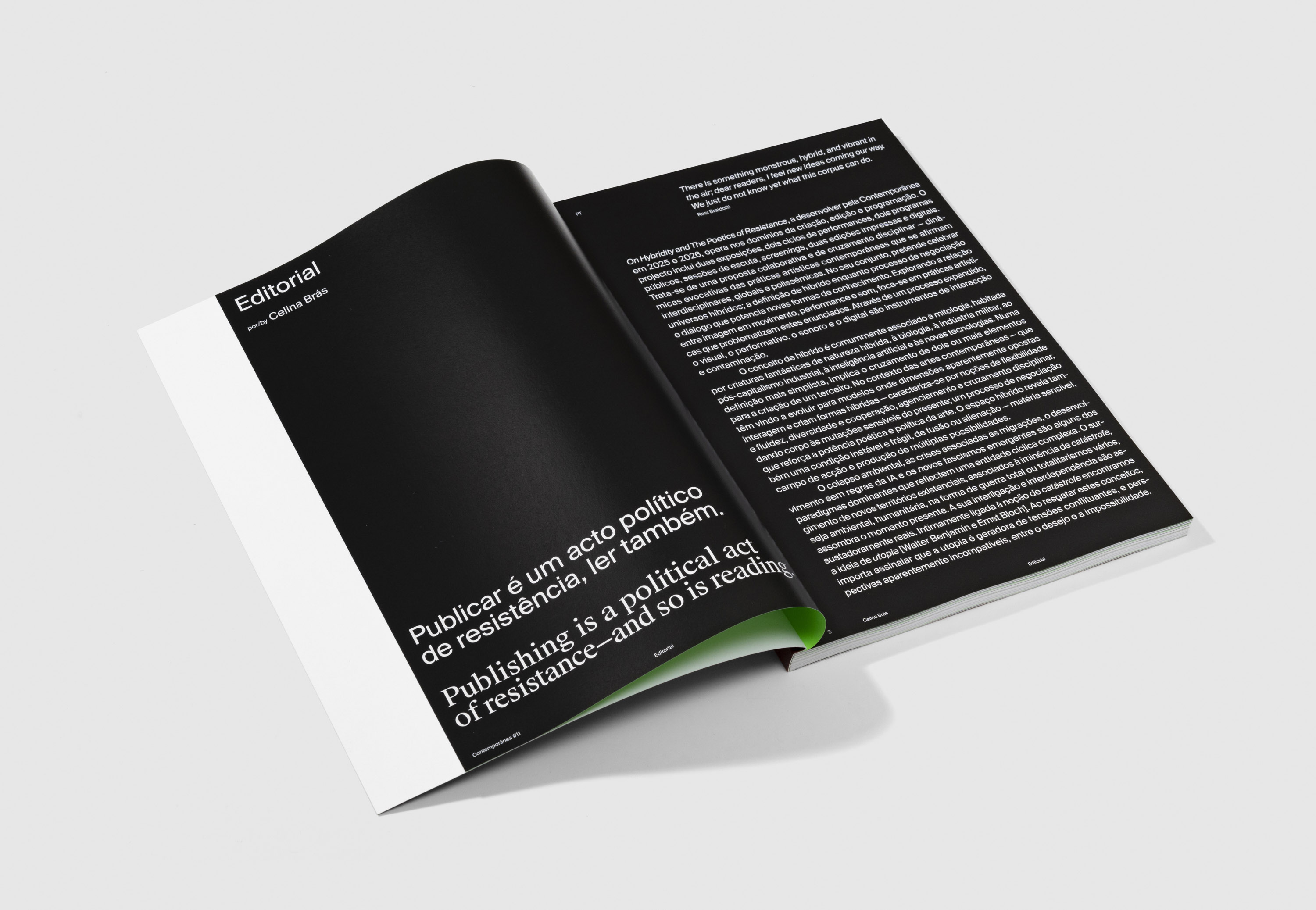 On Hybridity and The Poetics of Resistance, a desenvolver pela Contemporânea em 2025 e 2026, opera nos domínios da criação, edição e programação. O projecto inclui duas exposições, dois ciclos de performances, dois programas públicos, sessões de escuta, screenings, duas edições impressas e digitais. Trata-se de uma proposta colaborativa e de cruzamento disciplinar — dinâmicas evocativas das práticas artísticas contemporâneas que se afirmam interdisciplinares, globais e polissémicas. No seu conjunto, pretende celebrar universos híbridos; a definição de híbrido enquanto processo de negociação e diálogo que potencia novas formas de conhecimento. Explorando a relação entre imagem em movimento, performance e som, foca-se em práticas artísticas que problematizem estes enunciados. Através de um processo expandido, o visual, o performativo, o sonoro e o digital são instrumentos de interacção e contaminação.