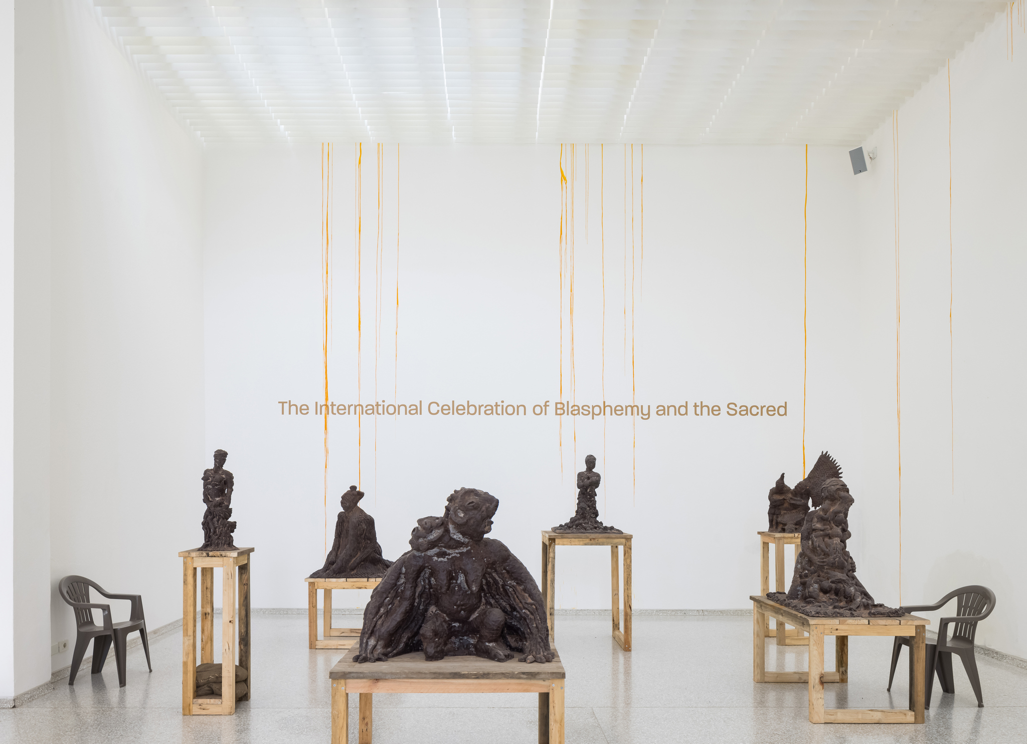 Os membros do CATPC trabalham principalmente com escultura, mas também com tapeçaria de juta, desenhos, filmes e performances. No Pavilhão dos Países Baixos da 60ª Bienal de Veneza (Foreigners Everywhere, 2024), apresentaram The International Celebration of Blasphemy and the Sacred, em colaboração com Martens e sob curadoria de Hicham Khalidi.6 O título surgia escrito na parede em letras volumosas, com óleo de palma a pingar do teto como se fosse sangue. Esculturas de cacau e óleo de palma, dispostas sobre pedestais de madeira, exalavam odores intensos. As figuras, poderosas e expressivas, são veículos para a transmissão de histórias coloniais de violência e denunciam a ganância capitalista — inclusivamente no mundo da arte —, enquanto dão corpo à transformação e à reparação. As obras são criadas por membros do CATPC e criticadas coletivamente. A decisão sobre o mérito estético e conceptual de uma escultura para ser exposta é tomada em grupo. Três novos filmes integram a exposição: The Judgement of the White Cube; CATPC; e The Return of Balot. Uma transmissão em direto ligava o Pavilhão dos Países Baixos à sua exposição geminada no White Cube de Lusanga, permitindo o encontro em tempo real entre os visitantes dos dois espaços.